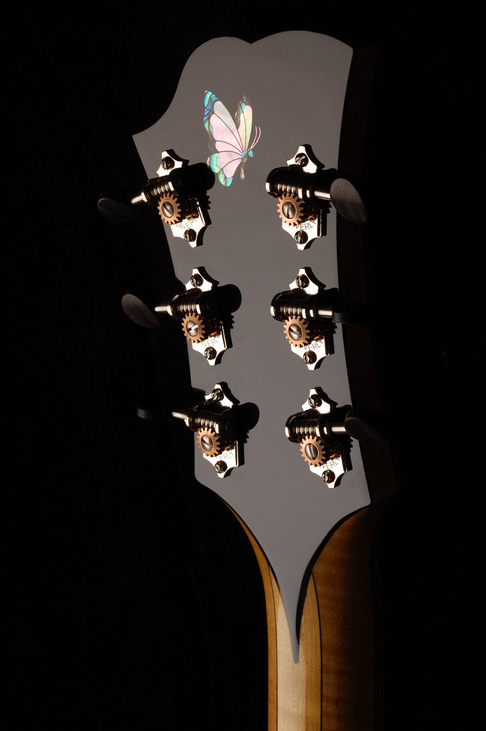 Ebony veneered headstock adorned with butterfly inlay and Waverly tuners
