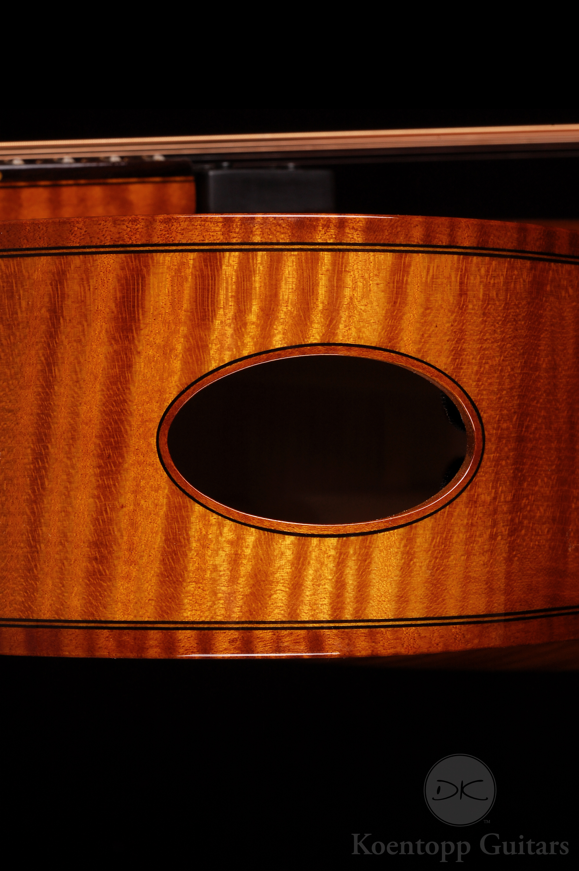 I’ve experienced sound ports on other guitars but I had never done one up until now and I have to say I am really on board. It is such a nice thing to hear the guitar in your face, the way the guitar would sound if you were sitting in front of it. The hole raises the resonance frequency of the sound box by a very small degree but nothing too detrimental to steer me away from it. The sound port also allows for a useful location for the volume and tone controls where, on the Amati, real-estate is more of an issue.