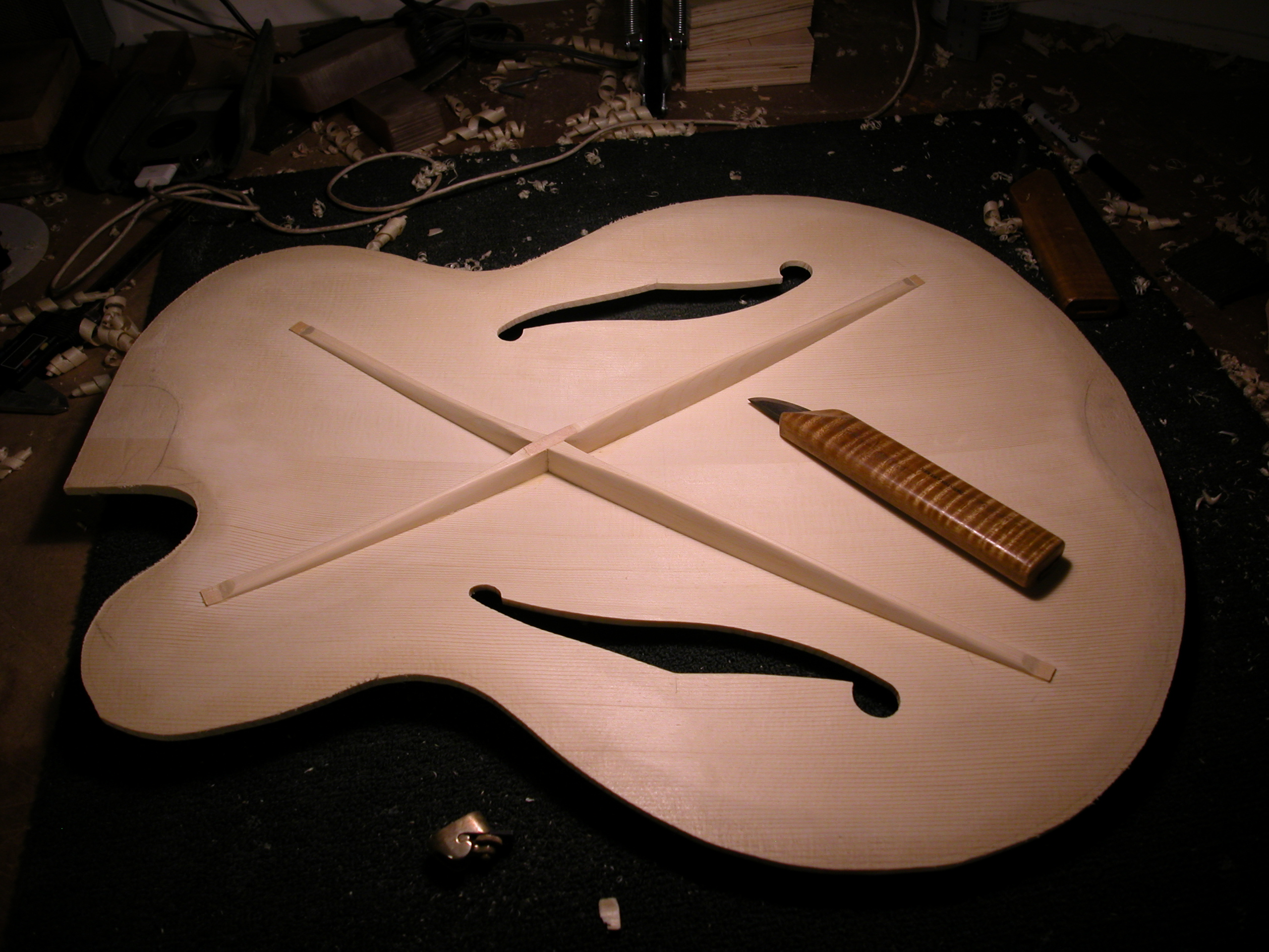 An archtop guitar acts differently than a flat-top. The strings are fixed to a tailpiece which is attached to the back rim of the guitar. As a result, the forward pull of the strings is dispersed through the majority of the guitar’s body and not solely on the top. In this situation the force acting on the top is in a downward direction at the bridge. The braces support and unify the top but they do not need to be designed to counter the pull of the strings.