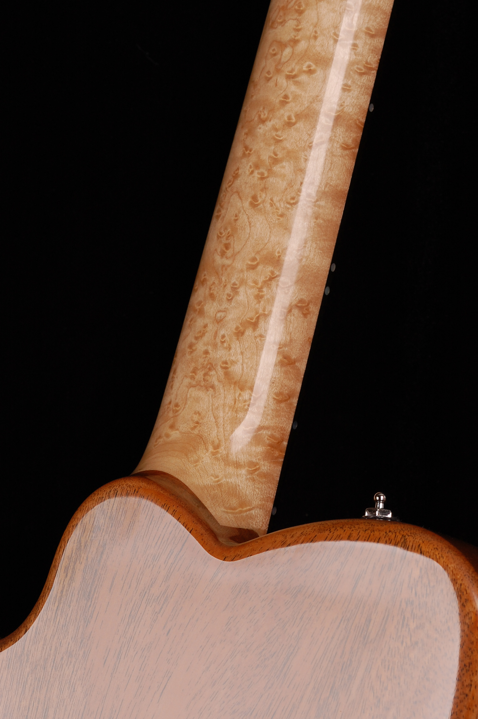 Every year or so I do a batch of electrics, usually a batch of four guitars. Each guitar is built off of the same construction design, with the floating-neck through concept. This construction concept uses the natural taper of the neck as a long wedge which mates as a tight dovetail to the chambered body. The chamber shape of the body has evolved over the years to balance weight distribution and resonance. Every guitar is designed around a specific client which allows the discussion and playful use of tonewoods. I have found a great relationship with the use of a Honduran Mahogany body and the density and hardness of a slab cut Birdseye maple neck (not to mention they look so great together). All of the electrics come with hand made pickups by the legendary, Ron Ellis, a perfect pickup to bring out the beautiful nuances of these instruments. I could not think of a better pairing.