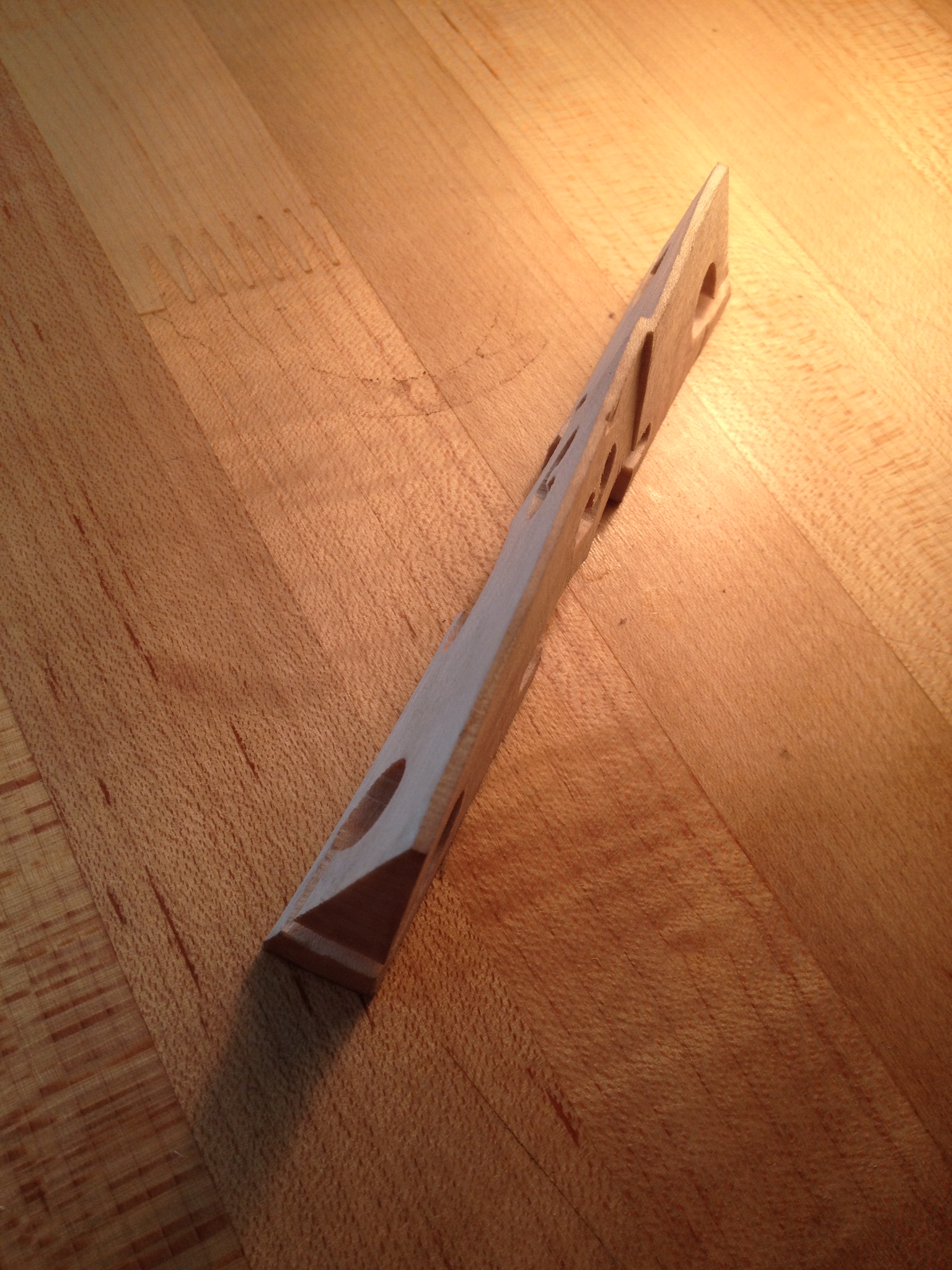 Lowering this bridge brought out some interesting observations. The lower bridge obviously became more stable. Some of the airiness and vibrancy was lost. It still sounded great but it was much quicker to decay. We put heavier .013 strings on to see what would happen. The guitar changed with a powerful voice, perfect for a rhythm instrument, but Amati owner and I were still after the sweet harp-like openness it had before. I knew I needed to rethink the bridge.