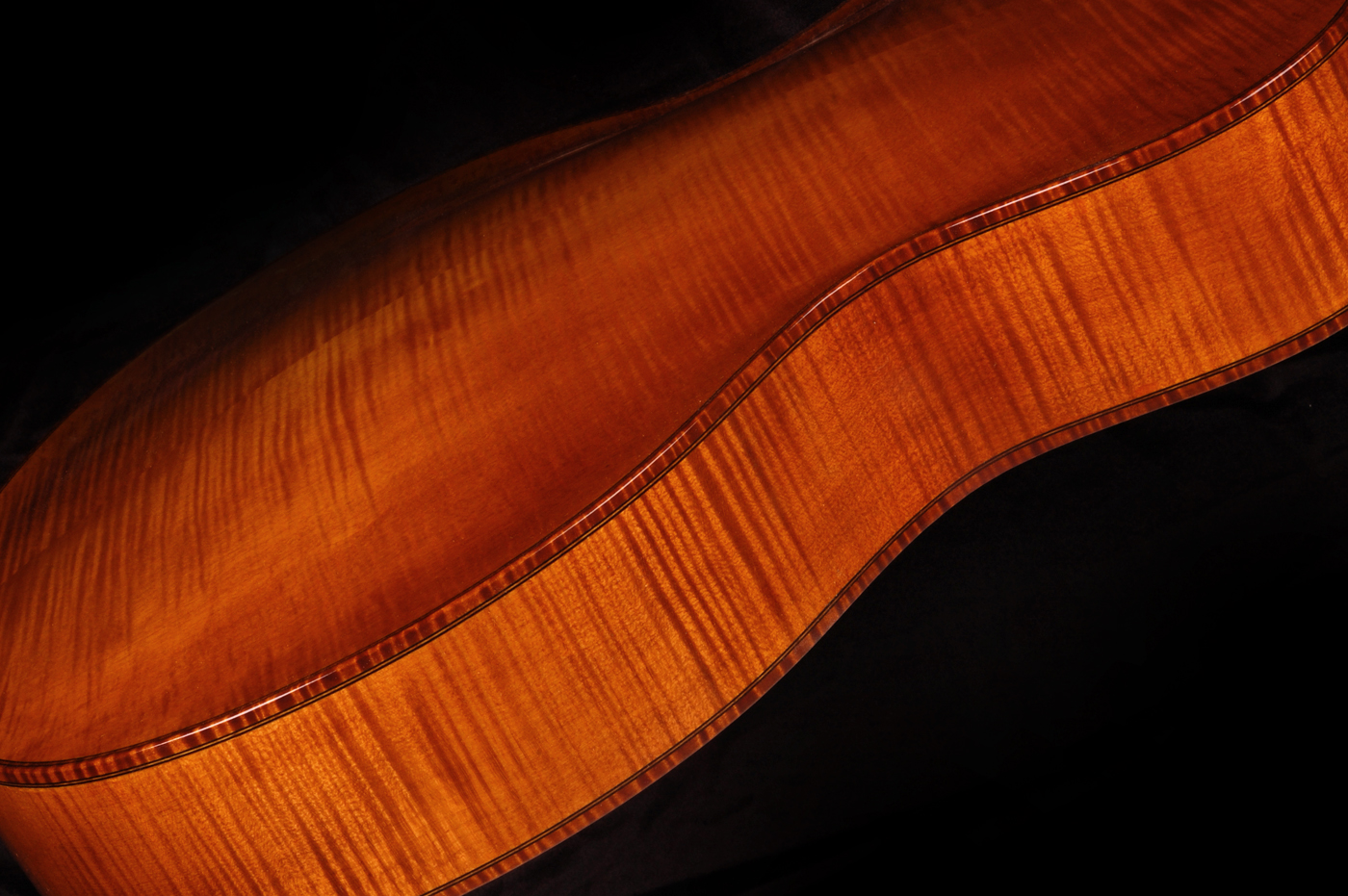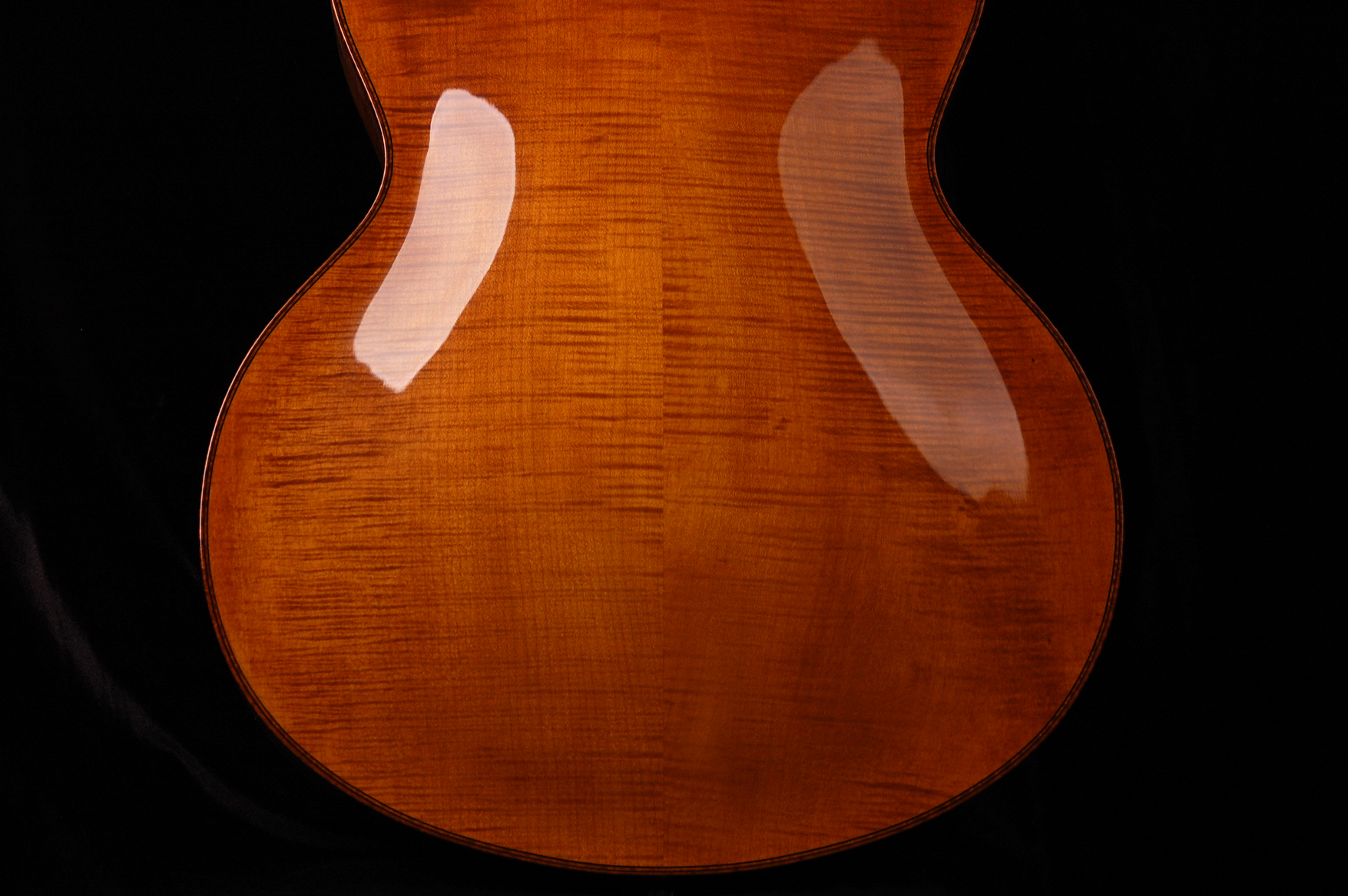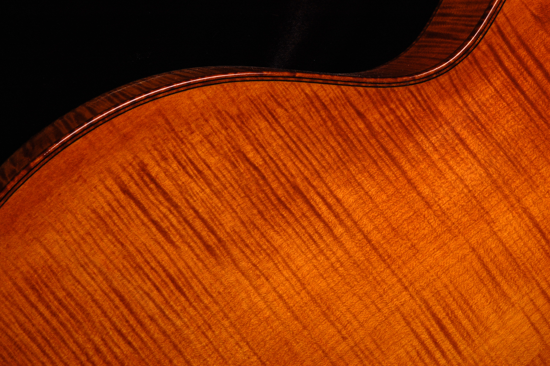 For this new Chicagoan, I chose a Romanian spruce top; a spruce that I love to use because of its sound complexity and color. I also chose a Carpathian maple back, but this set had a drastically different appearance to the set we used on the oval hole. The Oval hole back had a wide flame to it and was a little softer, this maple has a very tight flame to it. I knew that this guitar was going to be parallel braced, a bracing pattern that tends to employ a looser sound that is very much centered in the mid-range, very different than the wide-voiced oval hole. The specifications became defined and the vision of this instrument was growing.
