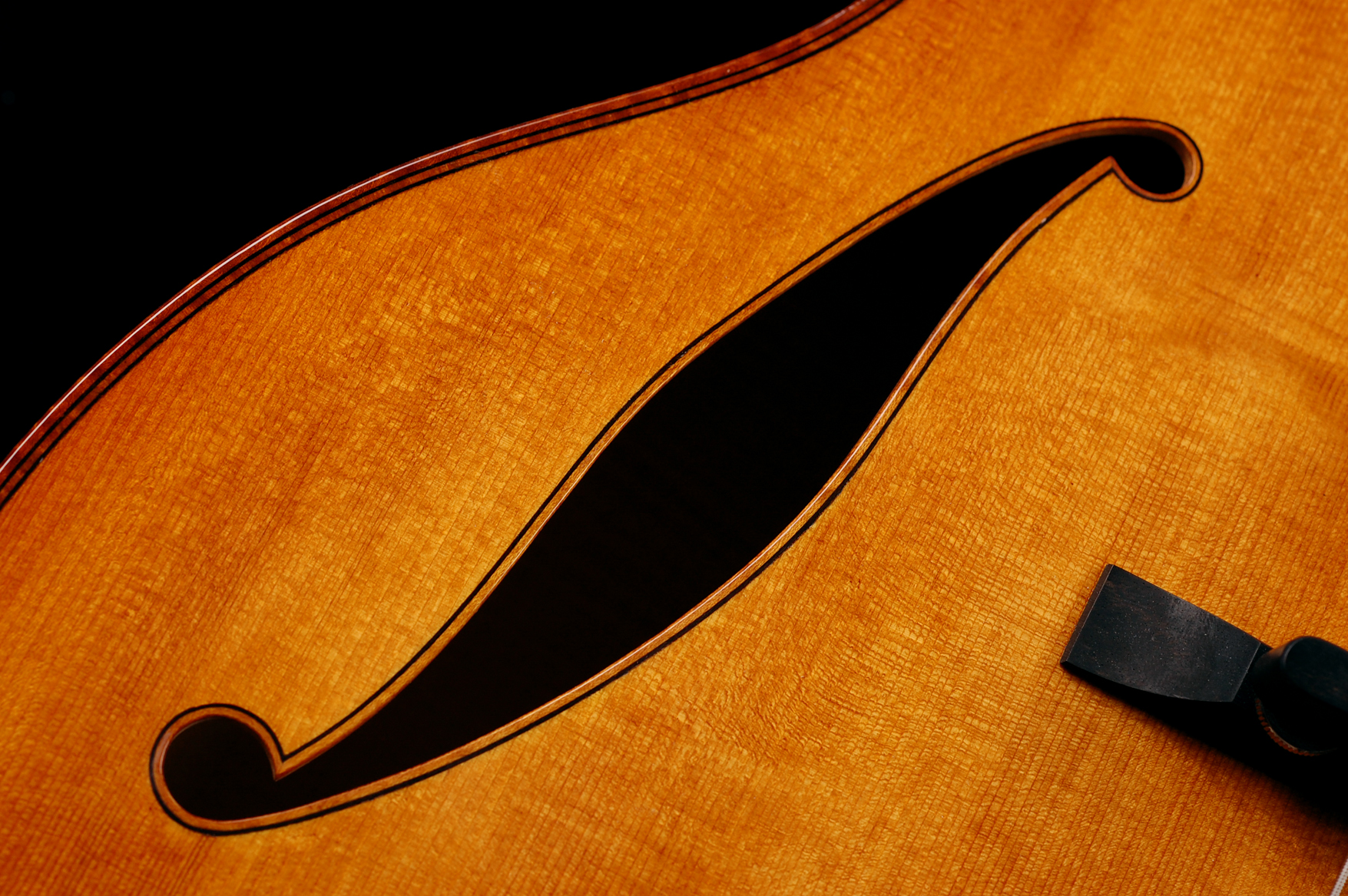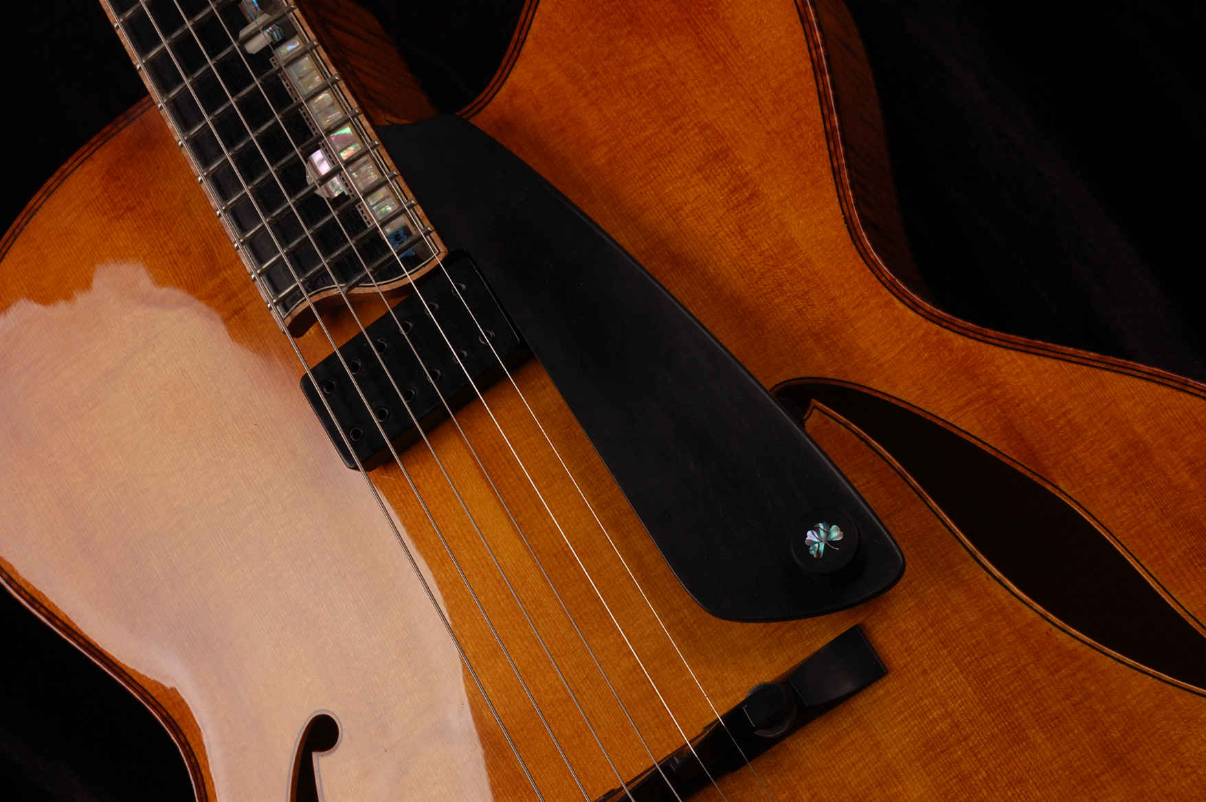 The 17″ outline reflects my old patterns and incorporates a soft cutaway. The materials are spruce, maple, and ebony. Nothing else unless you count the nickel Waverly tuners, the Kent Armstrong pickup, and the inlay. I have grown attached to making my own purfling strips on the top and back which reflect the simple and elegant purfling lines of a violin or cello. I also like making my own binding because I can control the contrast of the woods. On this guitar, I chose a maple for the binding that was naturally darker than the body maple so it creates a nice visual frame for the instrument (on a side note, that maple was such a pain in the ass to bend and I’m glad that was the last of that stuff!). The fholes are bound with this maple as well. The neck is laminated with three pieces of flame maple which features ebony accents at both the heel and the headstock. The black ebony is a great backdrop for Larry’s incredible inlay work. The bridge and tailpiece are both carved out of solid ebony and done in such a way to achieve the best strength and energy transfer while being strong enough for the strings tension throughout the instrument’s life.