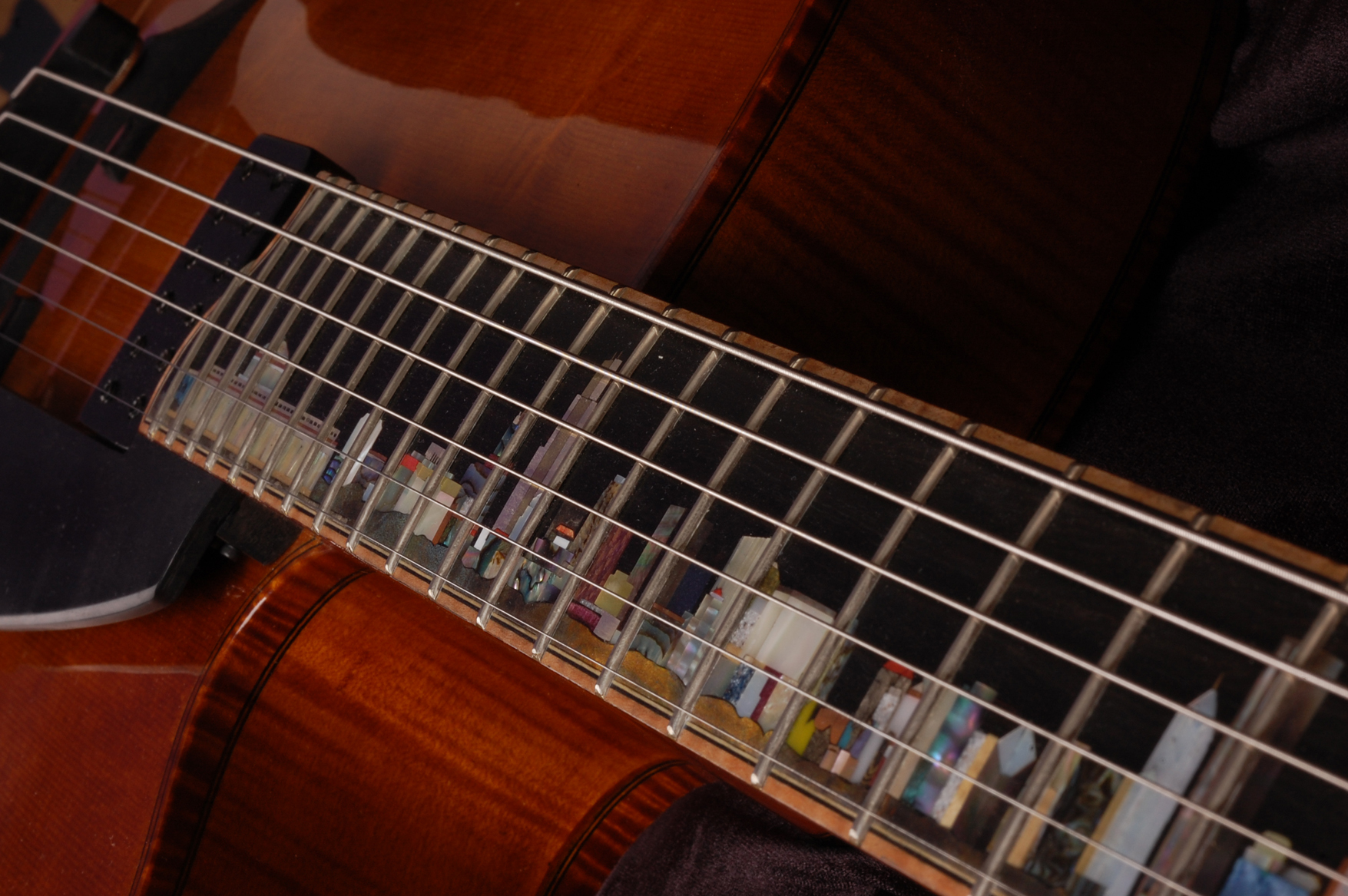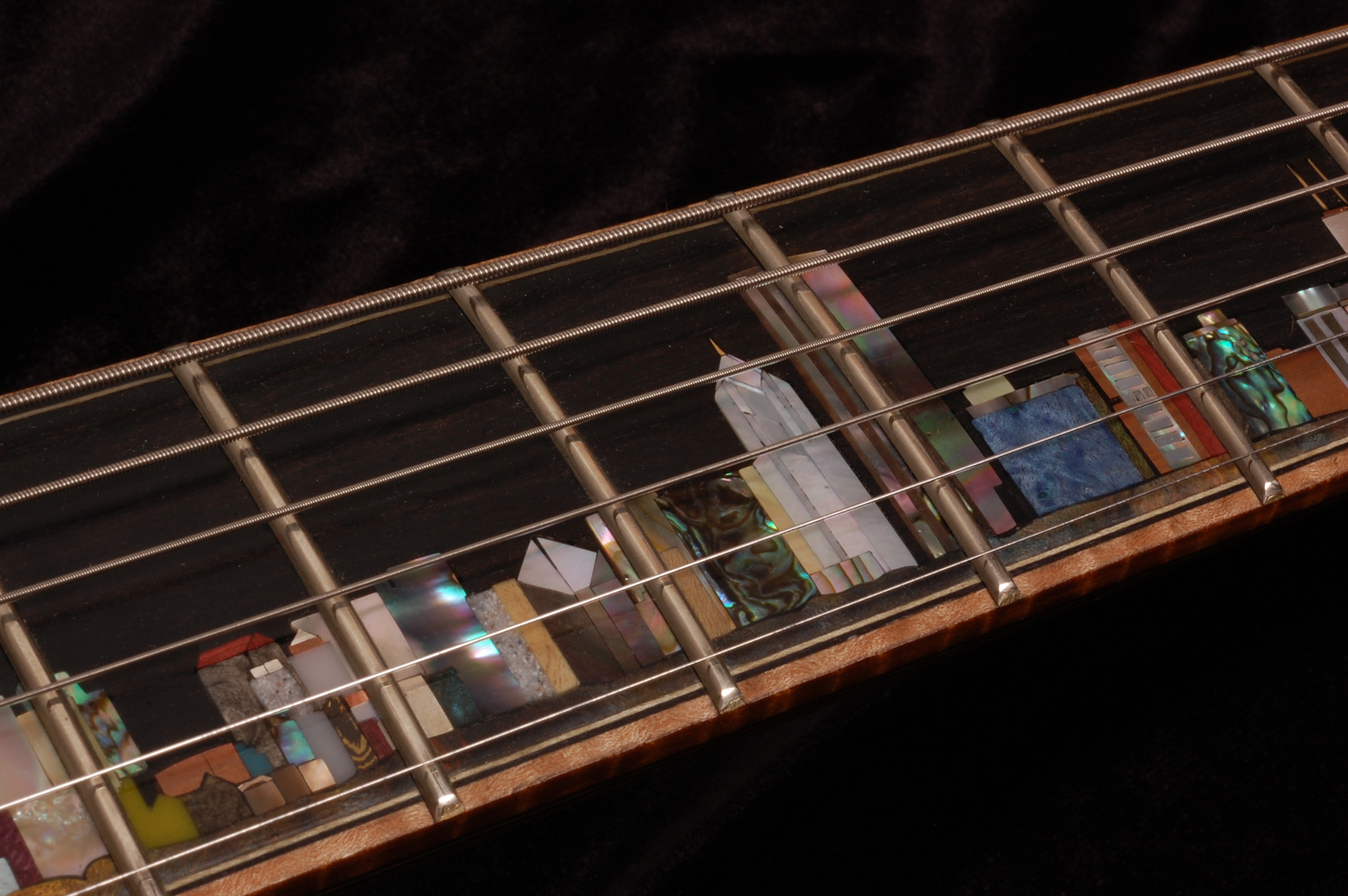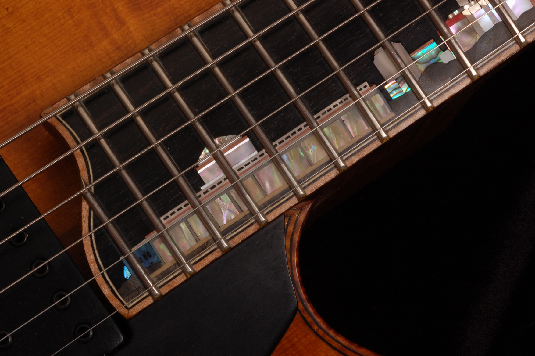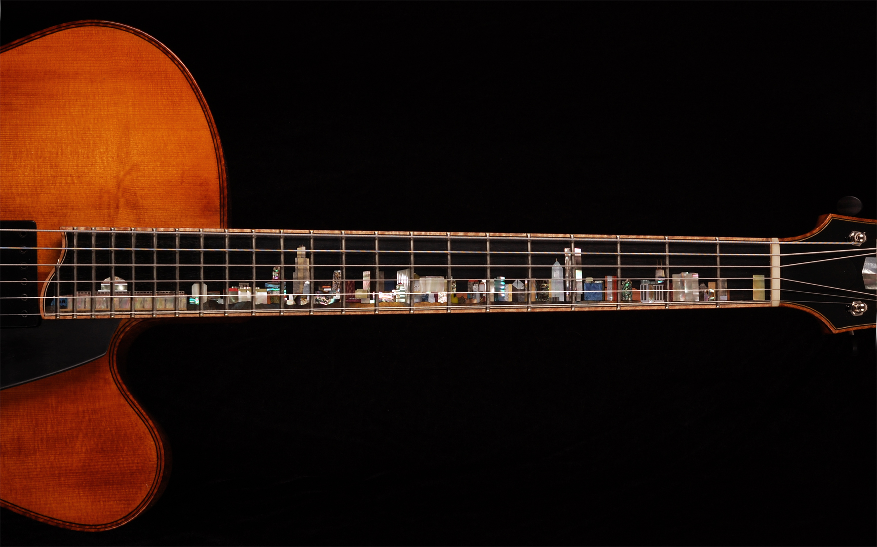 All along I knew that this was a bigger inlay project that I wanted to take on and that someone like Larry Robinson would knock it out of the park and put his own unique stamp on it. After getting the buildings laid out in perspective and in an accurate fashion, I outlined every building so that Larry could have something to work with. I spoke with Larry about it and he was also very excited for the project as he had done various city skylines but never Chicago and the design I sent him was certainly a challenge. I had high expectations just because I knew what Larry was capable of producing but I was just speechless when I received the finished inlay. I had sent Larry a rough neck with the fingerboard and when it came back the last thing I wanted to do was to put frets over it. It took a lot of extra time installing the frets than normal. Such care had to be taken not to break any of the inlay and to not scratch any of the delicate materials Larry had chosen to use.