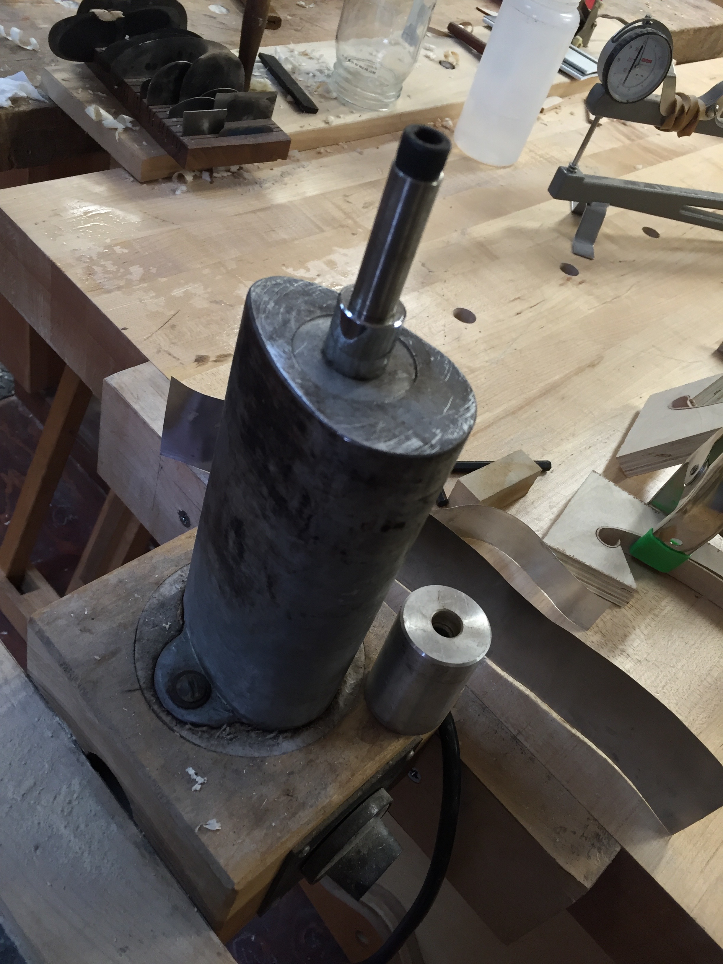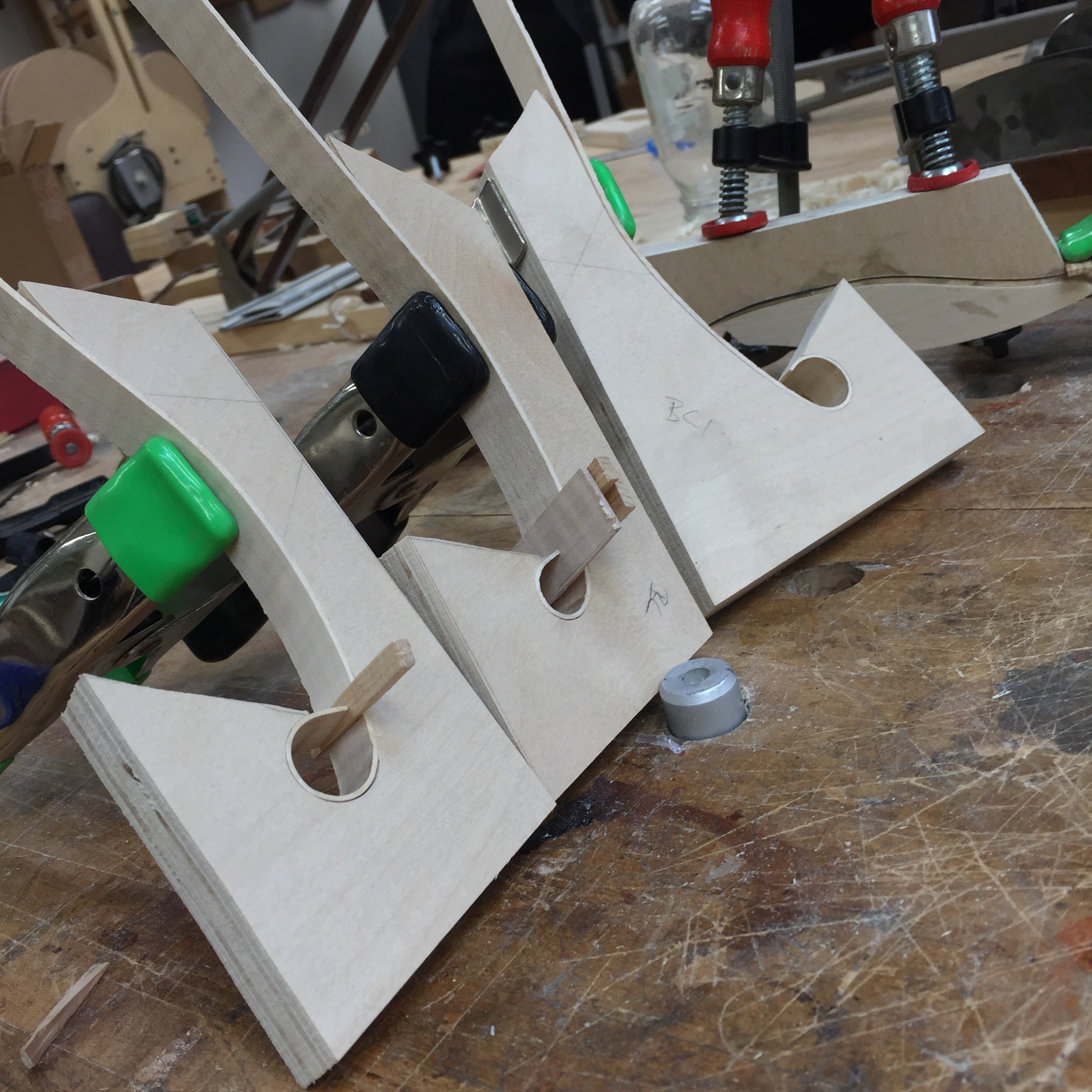 Installing wood binding in fholes can be a tricky job. This method is straight forward and allows one to do a lot of the work off of the guitar in order to get a clean result when time for glueing. My fholes have two edges or binding strips, for other fhole designs this method would work just as well. I bend the wood strips on smaller steel shafts off an electric bender and put them into a mold. Once cool, I laminate the other binding veneers in the same mold. The dry binding strips are then ready to be installed into each fhole.