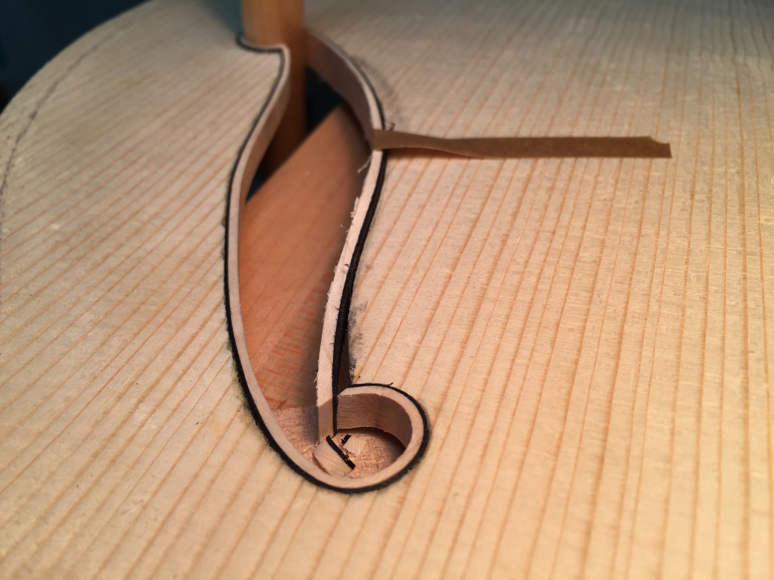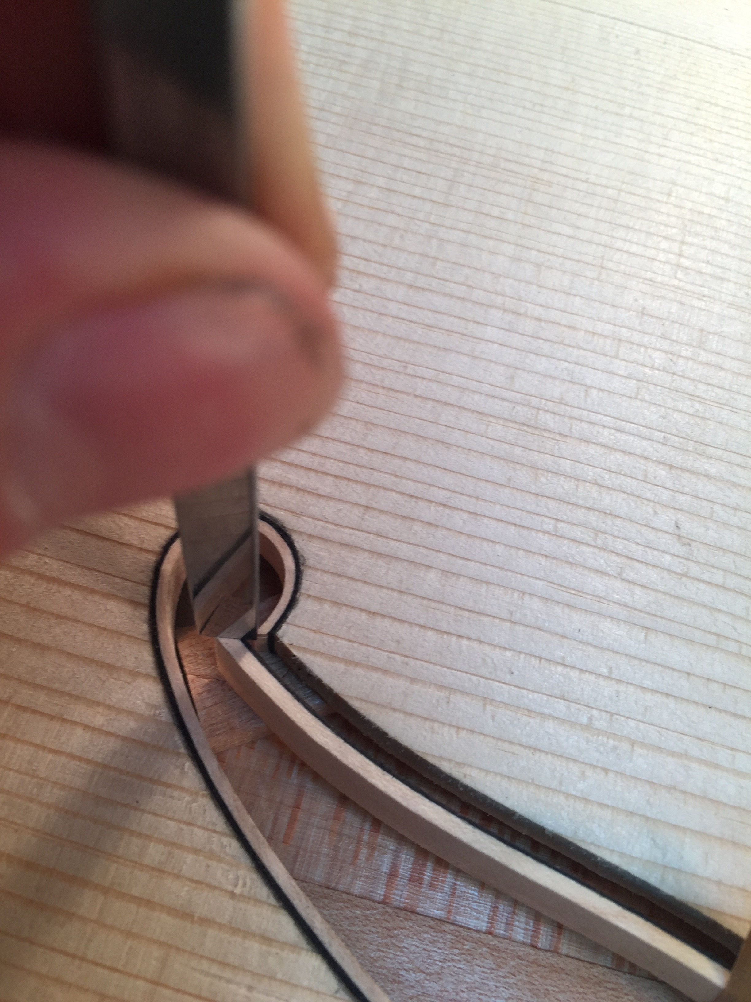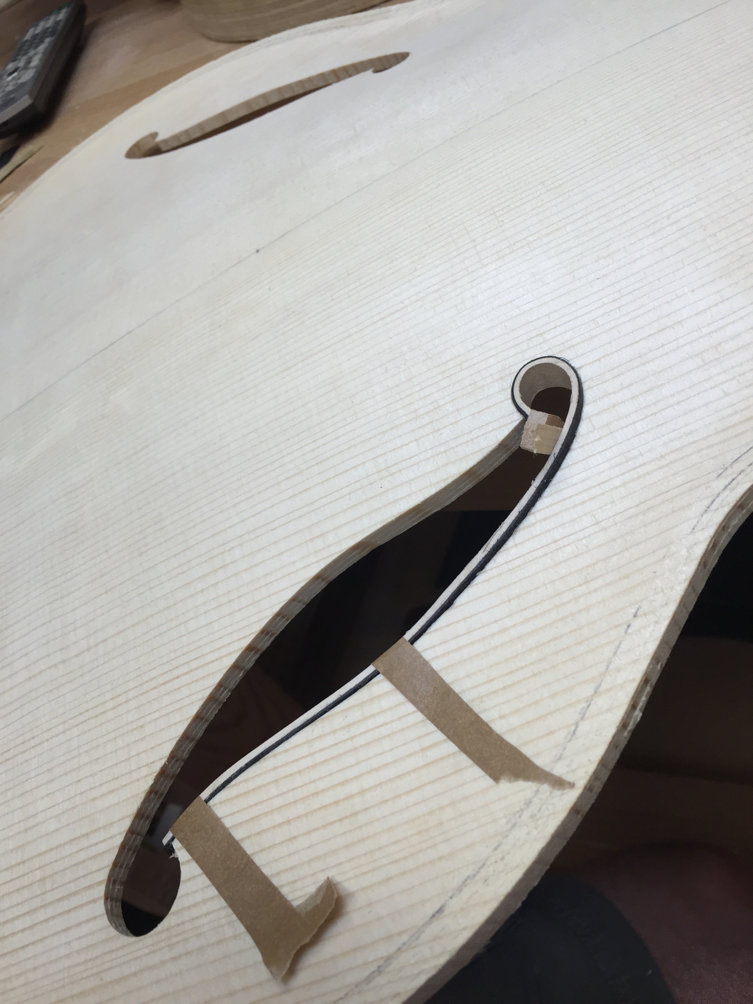 Binding an fhole with wood is one of those steps that takes patience. Here’s a pretty straight forward setup that makes it a little easier to install with a cleaner result.