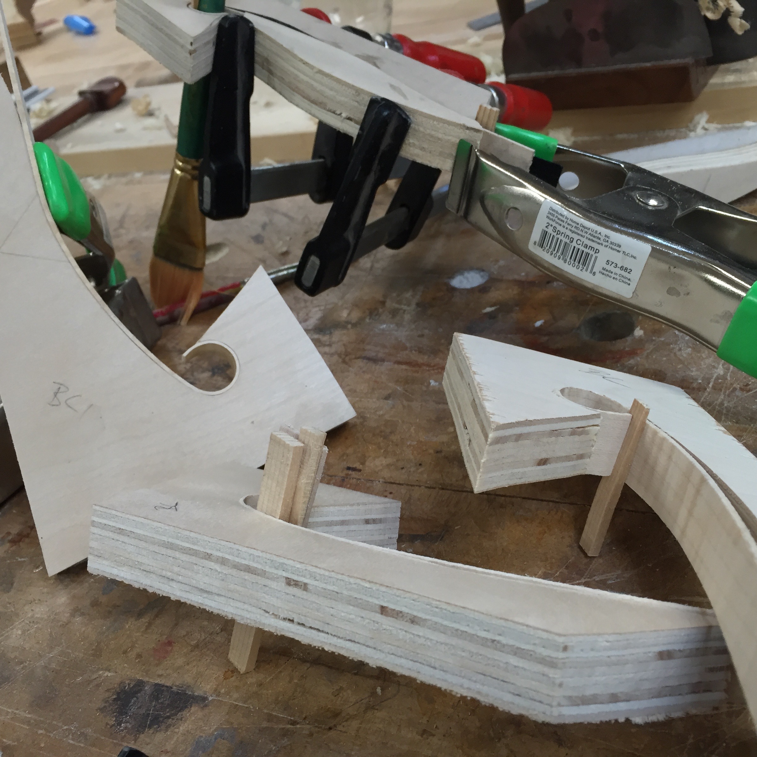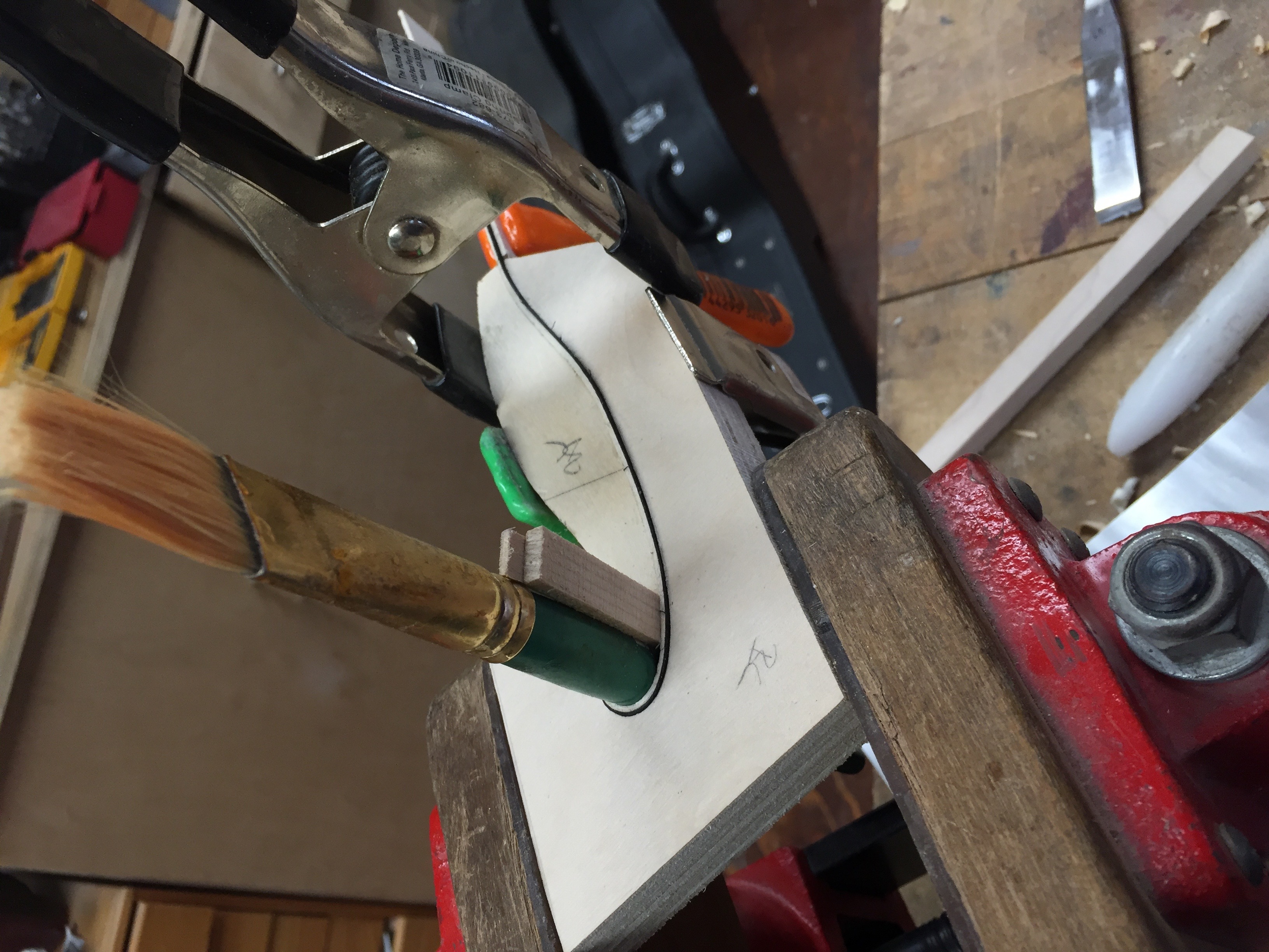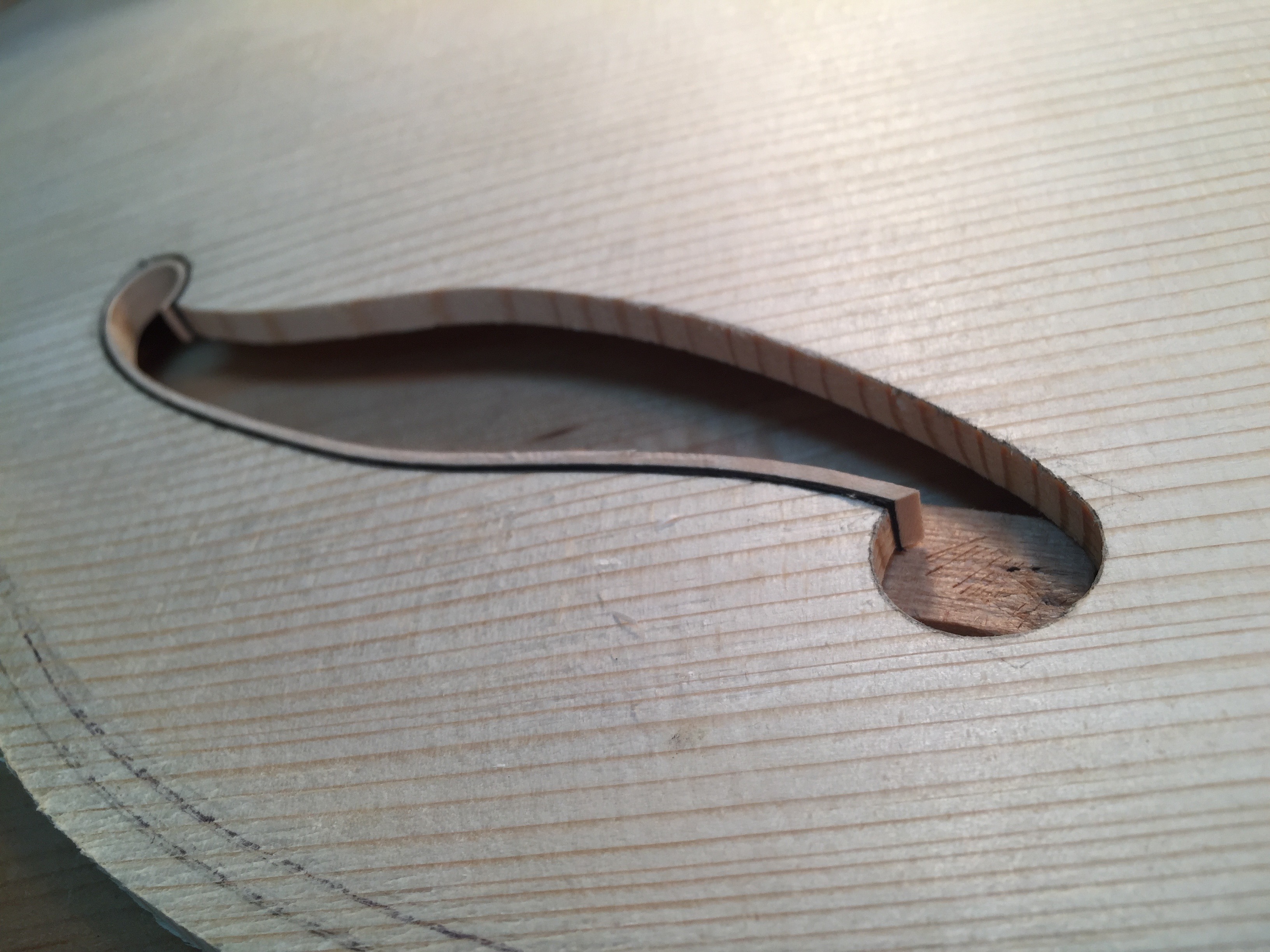 When I thickness my main outer binding, I taper the piece of wood slightly at one end. This slight thinning makes it easier to pull around the hot pipe and conform to the tight fhole eyes without creasing or breaking. I also test out pieces of wood before I choose it for binding to make sure it bends significantly well without being a total pain in the butt.