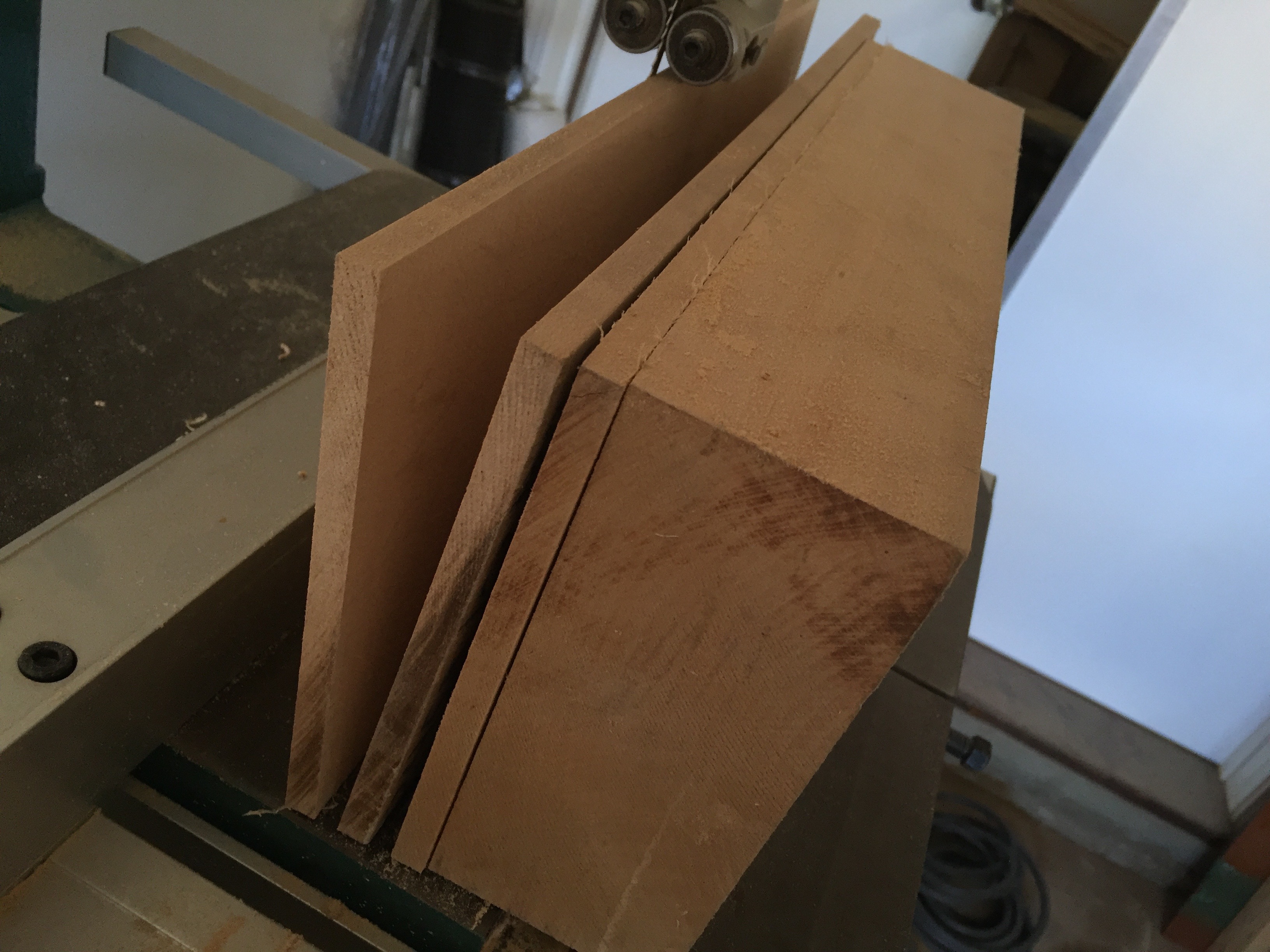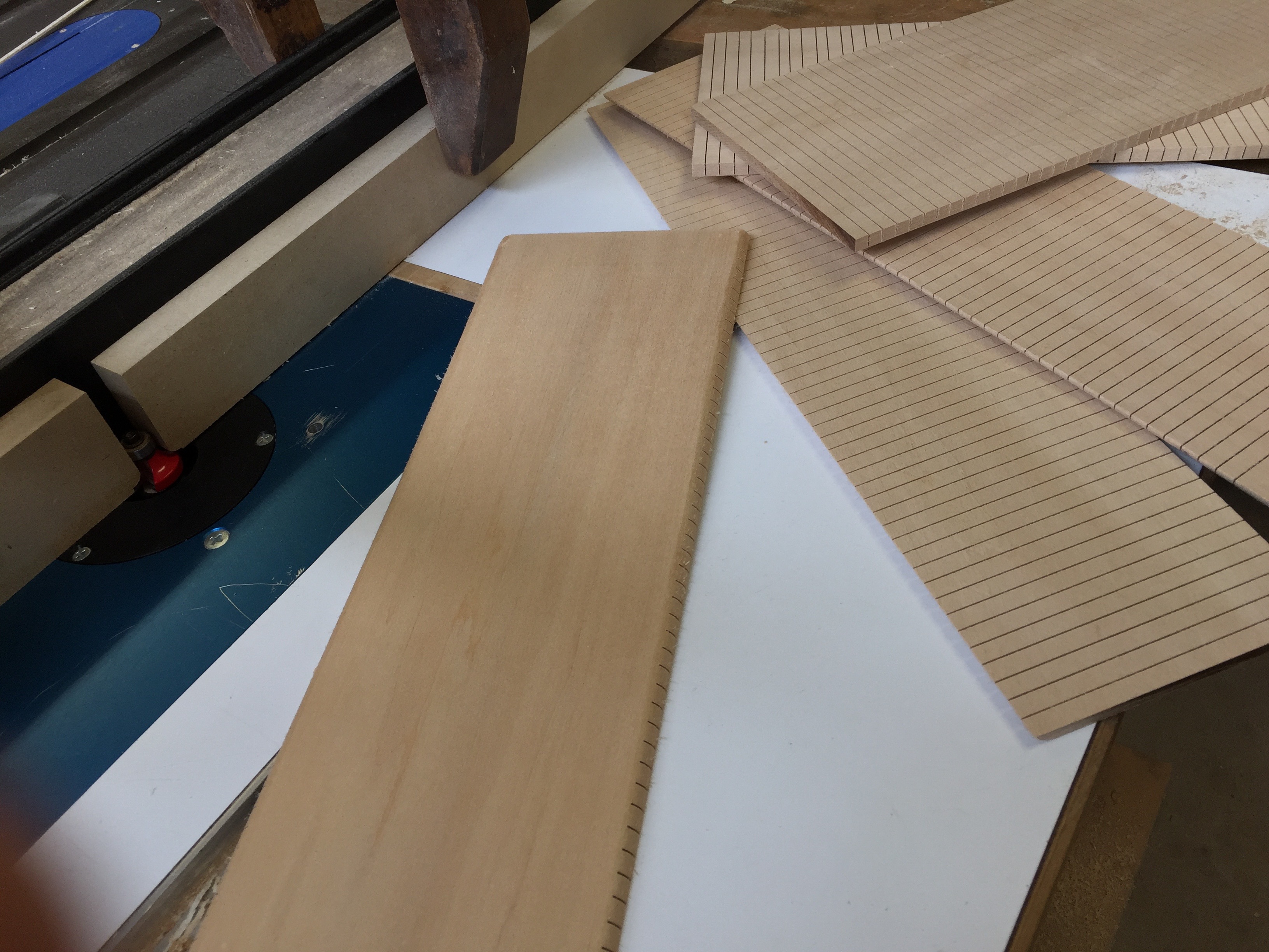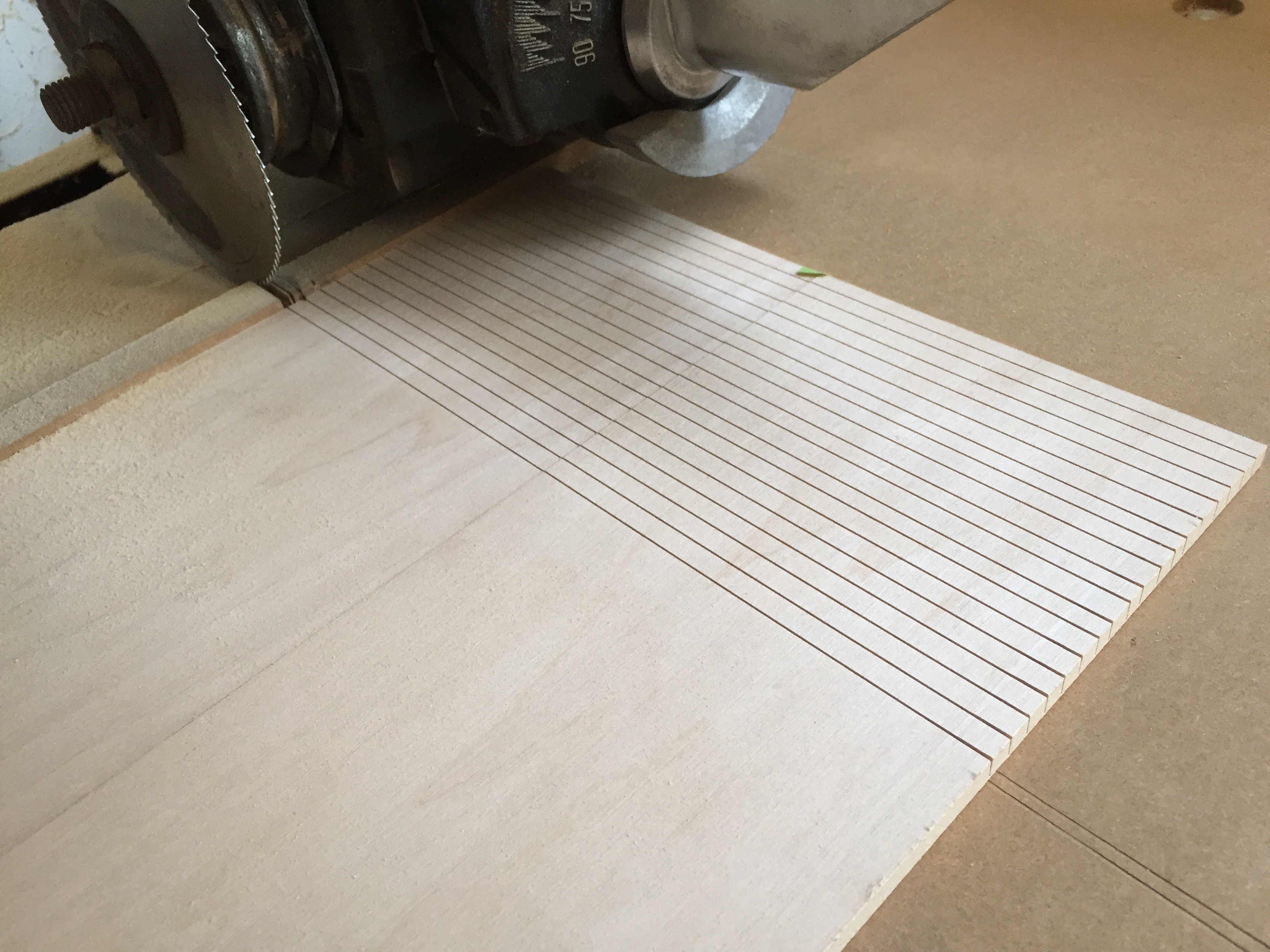 After a quick pass in the drum sander the boards are kerfed on a radial arm saw with a fine tooth fretting blade and a pin in the fence. With the saw cutting almost through the material, it is important to keep firm pressure on the sheet.