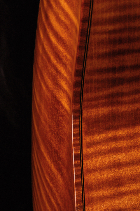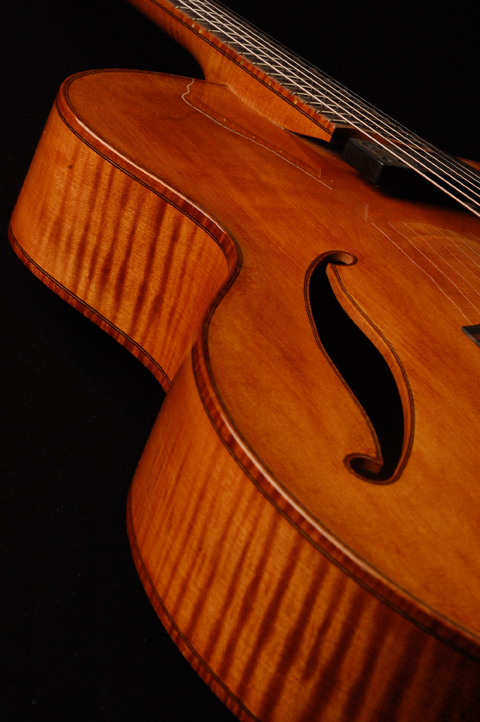 There are also a number of non-standard touches that Danny did just for me that I’m very proud of. He planned a new f-hole design for my guitar that matched both aesthetic (symmetry and softness) and acoustic (I’d let Danny say more here, but some of it has to do with a combination of openness and the complexity that comes from more top surface vibrating) goals that we had. He also let me get creative at the last minute to have a gorgeous inlay of St. Cecilia designed and created that he set in the back of the headstock. We discussed wood options to best meet our aesthetic and tonal goals and settled on really beautiful European tonewoods.