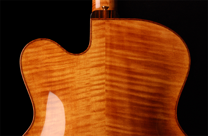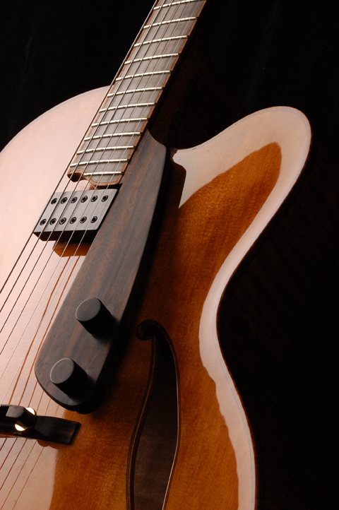A number of elements of my instrument were standard to Danny’s “Chicagoan” model. It is a 17” Chicagoan with 22 frets and the curved fingerboard extension. It has a 25” scale length, a Kent Armstrong floating humbucker, Danny’s trim package and a 3-piece maple neck.