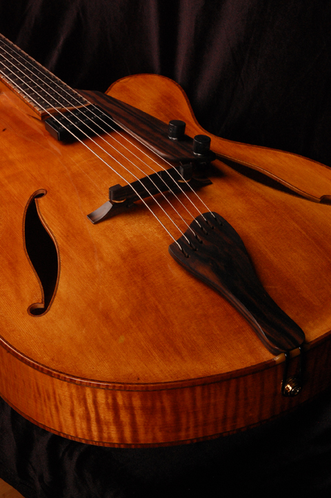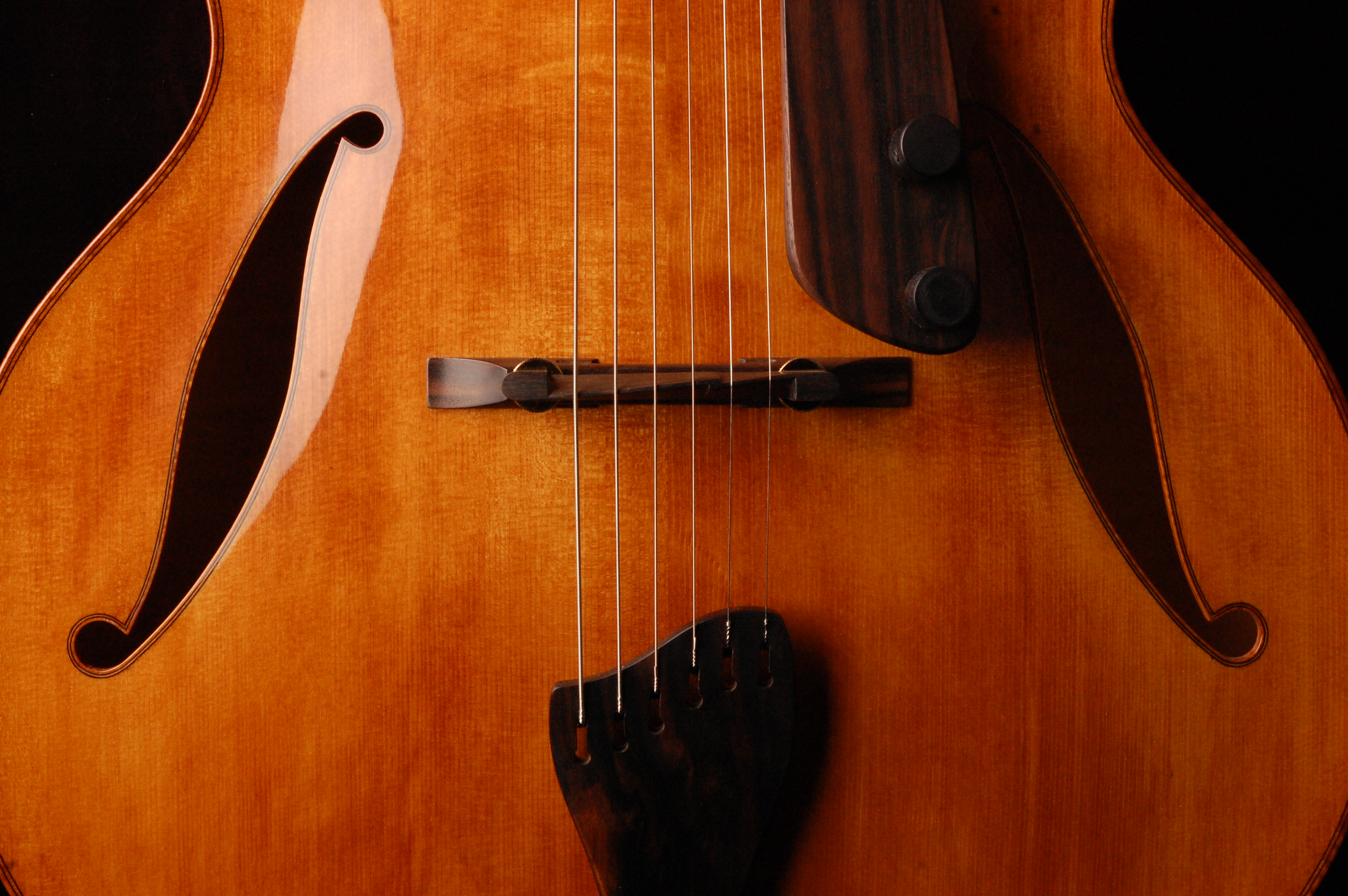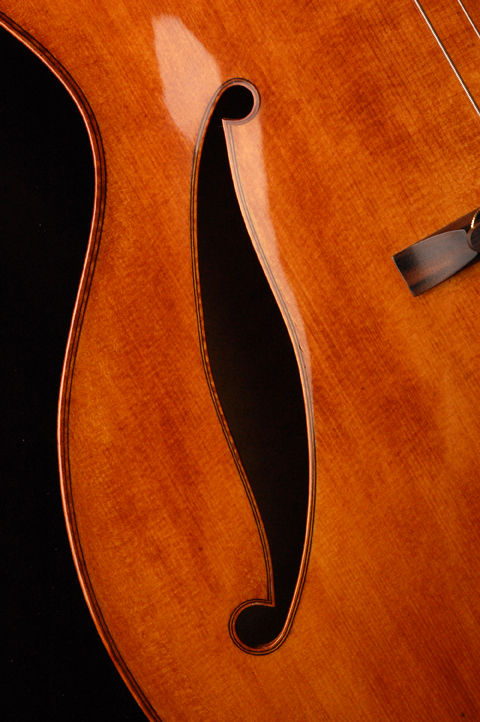 But I’m not a bass player it is my guitar, so I do care! So, what does it sound like?  It came out of the box with so many of the characteristics I wanted. It was a bit tight at first and needed to open up, but already had the clarity, a good deal of complexity and some of the shimmer. Since then, the sound has developed greatly. It is open, huge and responsive. In fact, I’ve never played a guitar this responsive. If I want it to sing with delicacy, it will; if I want to unload with drive and focus, it will; if I want clear focused single-note be-bop lines, it handles it without a problem; if I want to play complex chord voicings with every note balanced and the whole voicing rich, it delivers that with confidence. It can be dark, warm, shimmering, penetrating, gentle, and if I play in the lower register and a bit of extra attack, sounds like a roaring lion!