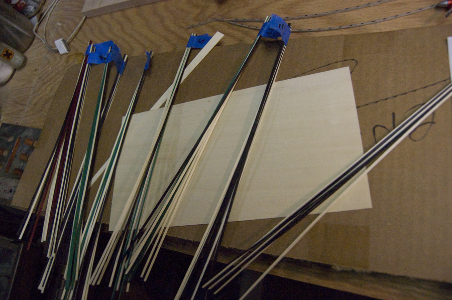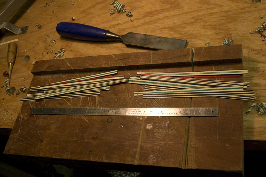 The first step is designing the mosaic tile pattern. The mosaic tile is made from cutting the cross section of a laminated log made from small strips of square veneer strips. It can be original or as complicated as you want, mixing different size tiles and changing the orientations. Once a pattern is decided, break it up into vertical sections. If the finished tile is ten squares wide you will have ten rows of stacked tiles. I detail this out in a diagram so that there is a reference to check the glue ups to make sure they are in order. Then, veneer strips are cut with a purfling cutter held against an edge so that each strip is the same width, about 2.5 mm (You could also use a ruler and a knife). The extra thickness makes it easier to glue up. Once all the strips are cut, group them together so that each row is complete.