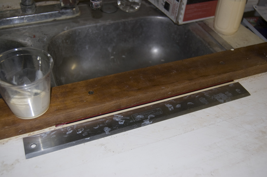 I use yellow glue for the rosette build because water is your friend. Thin the glue and apply it to one row of veneer strips at a time. It is messy and I find it very useful to do this part by a sink. Once the row stack is made you can wipe it down with a wet papertowl. I wax one of the walls of my shooting board and press the glued row up against it with a heavy straight edge. By the time I am gluing the next row and ready to let it set, the other one is dry. Glueing the strips in about 12″ lengths gives enough for two 6″ rosette logs.