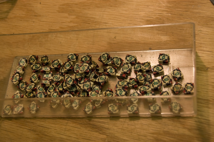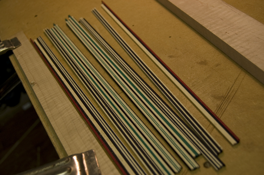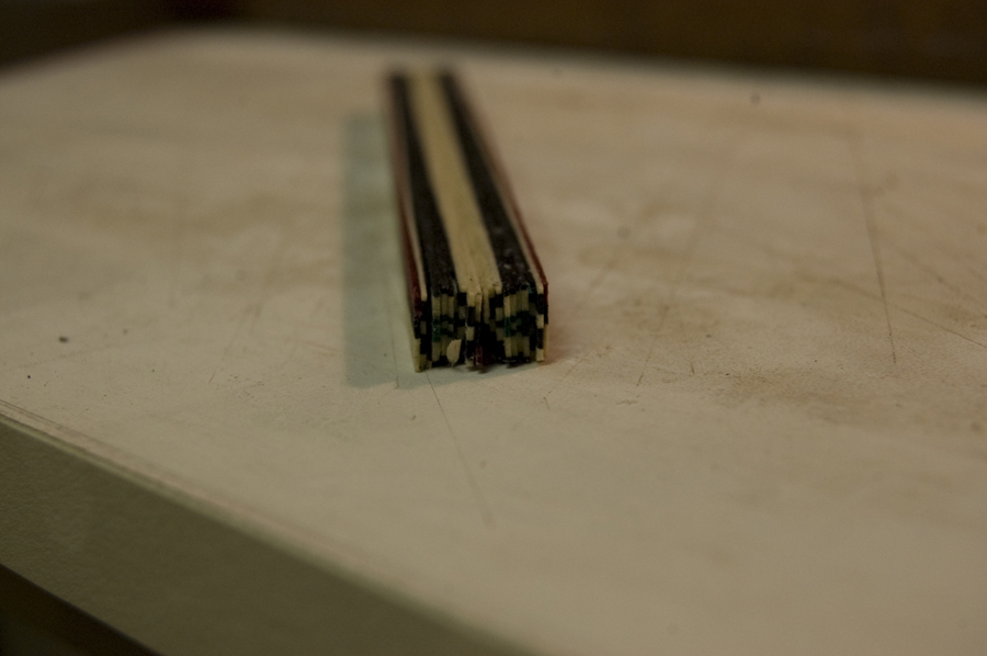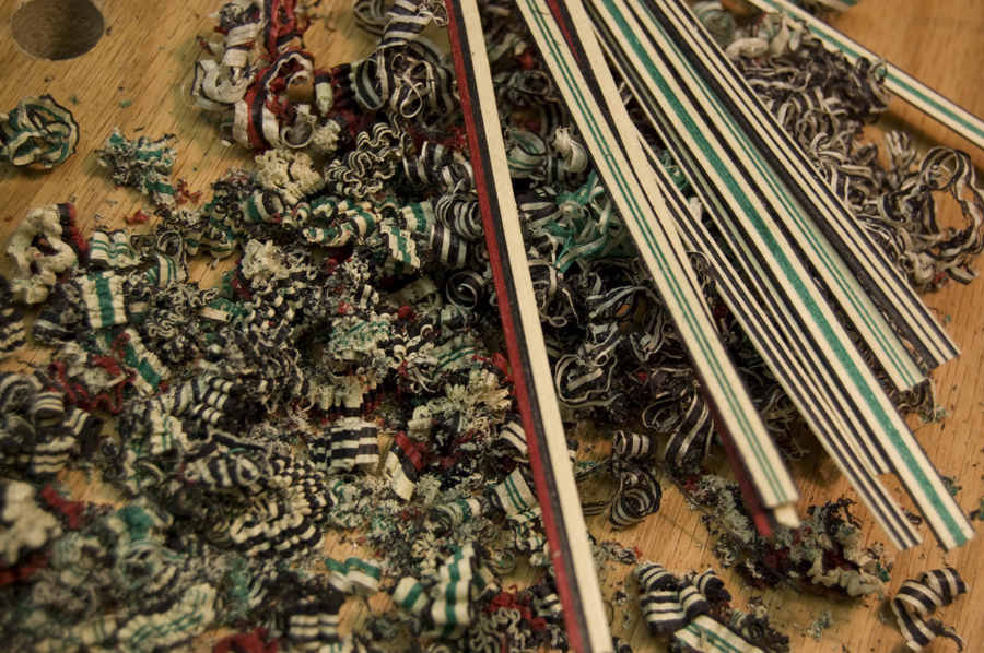 After the veneer rows are thinned they are cut in half and are ready to be glued. After making sure they are in order with your pattern you are ready for glue. I have seen some guitar makers use round molds and cauls to taper the tiles but I glue them up as I did the rows, nothing but thinned glue and hand pressure. The idea is that you want the same amount of clamping pressure every time so that you have consistency in all your tiles. When the tiles are inlayed, the glue can be used to soften the tiles and they can be negotiated and squeezed into position with an awl or the butt end of a wooden tool handle. Once the tile log is dry, they can be cut into 2mm slices and put aside waiting to be inlayed into the rosette.