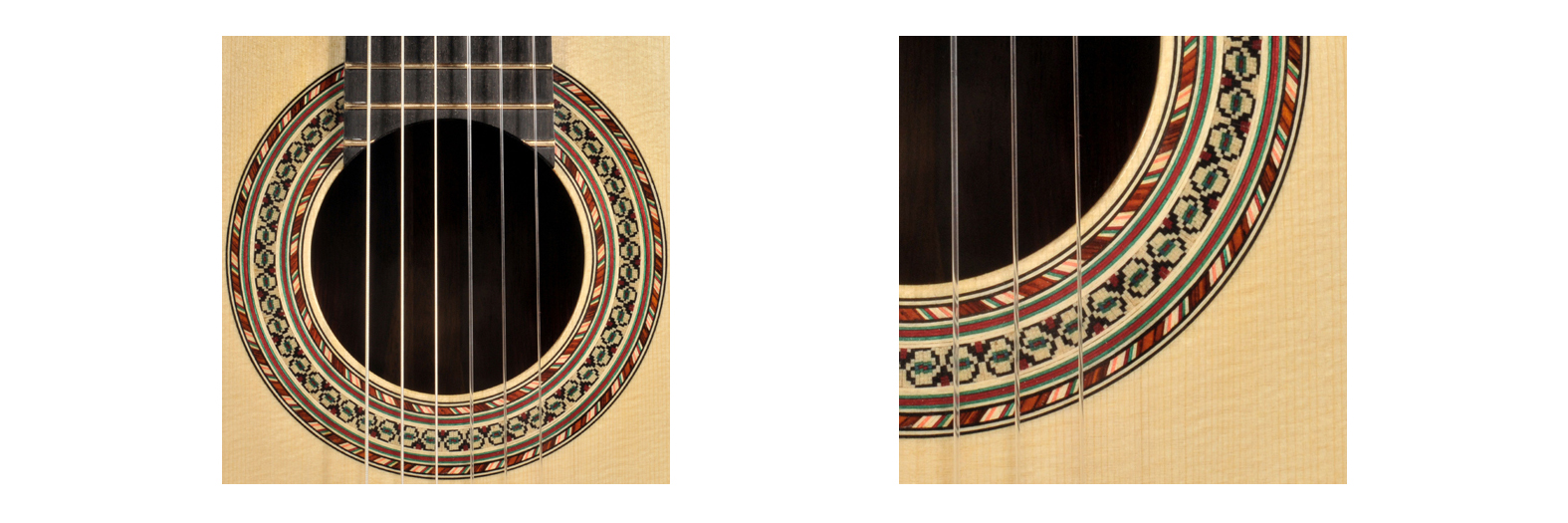 The rosette is not just a canvas for a guitar maker’s creativity, it has great structural purpose. It protects and seals the wood grain around the hole. A hole in a straight grained piece of spruce is very weak leaving exposed and changing wood grain. Without it the wood around the hole would be prone to cracking. The rosette is very important for adding stiffness and support back into a weak area of the top.