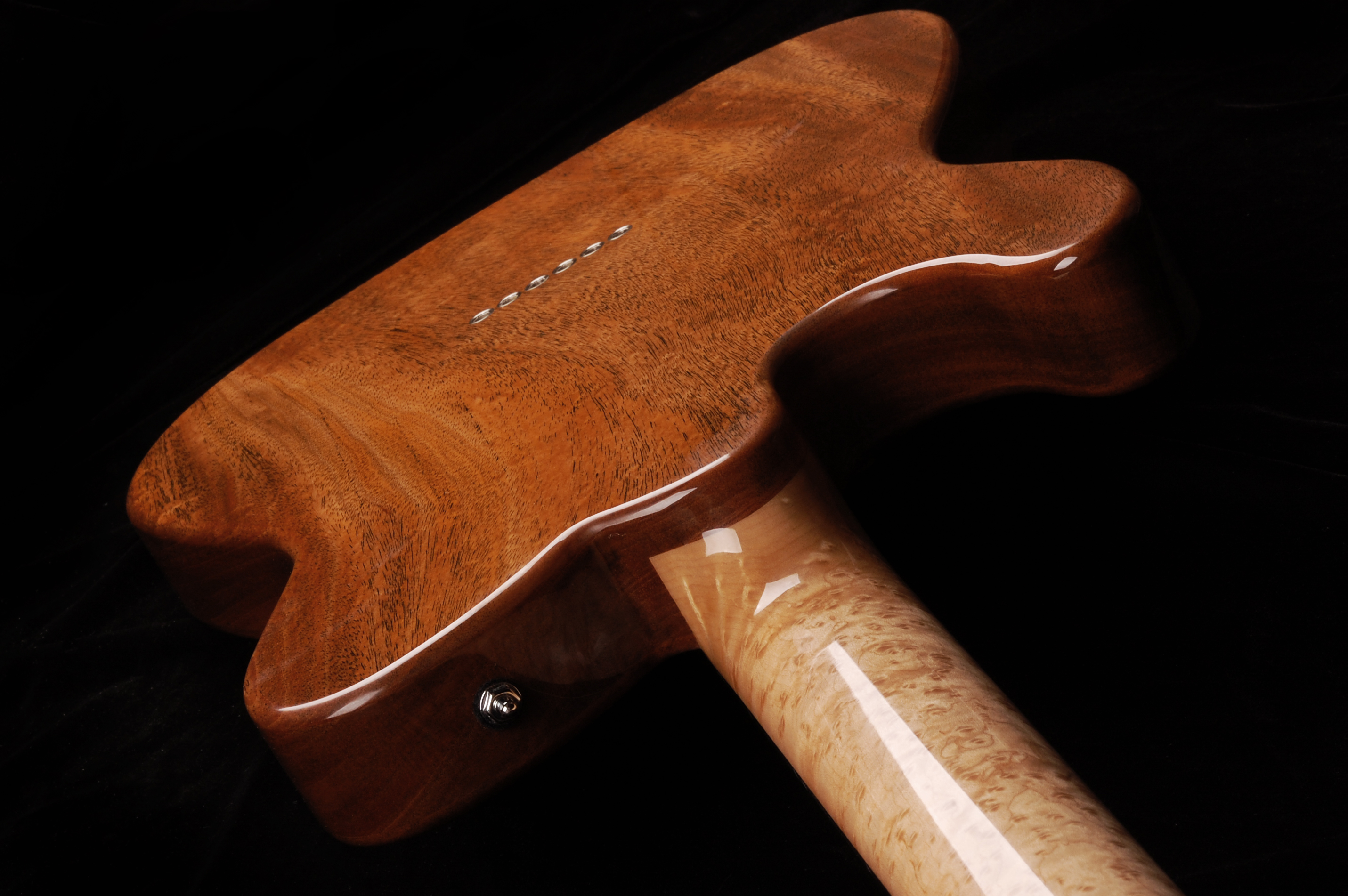 Every year or so I do a batch of electrics, usually a batch of four guitars. Each guitar is built off of the same construction design, with the floating-neck through concept. This construction concept uses the natural taper of the neck as a long wedge which mates as a tight dovetail to the chambered body. The chamber shape of the body has evolved over the years to balance weight distribution and resonance. Every guitar is designed around a specific client which allows the discussion and playful use of tonewoods. I have found a great relationship with the use of a Honduran Mahogany body and the density and hardness of a slab cut Birdseye maple neck (not to mention they look so great together). All of the electrics come with hand made pickups by the legendary, Ron Ellis, a perfect pickup to bring out the beautiful nuances of these instruments. I could not think of a better pairing.