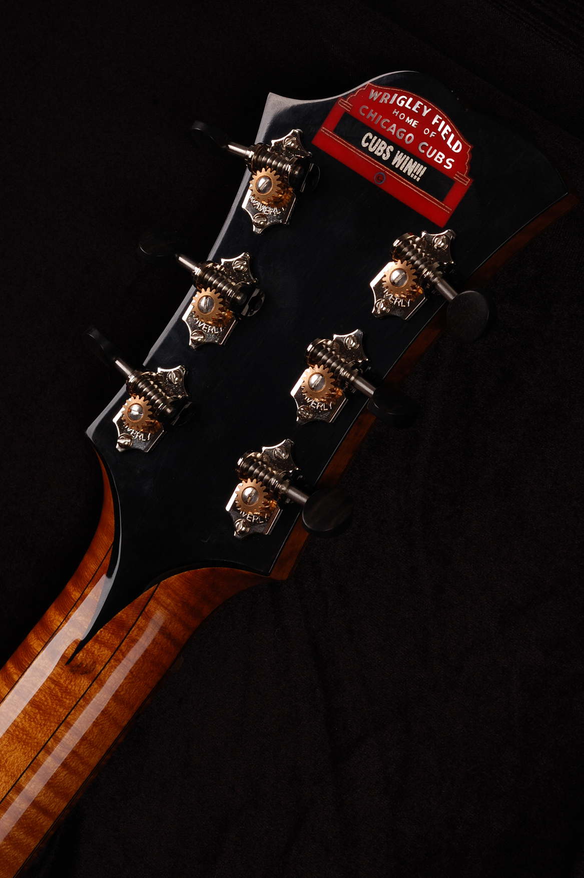 I always add a personal inlay on the back of the headstock for every client. Wrigley field was special to my client (another wonderful thing for me since I grew up four blocks from the ballpark) and so I had Larry inlay the world famous Wrigley Field marquee with the best words possible lit up in gold dust, “Cubs Win!”. This is also my attempt at breaking the cubs curse, you never know… 😉