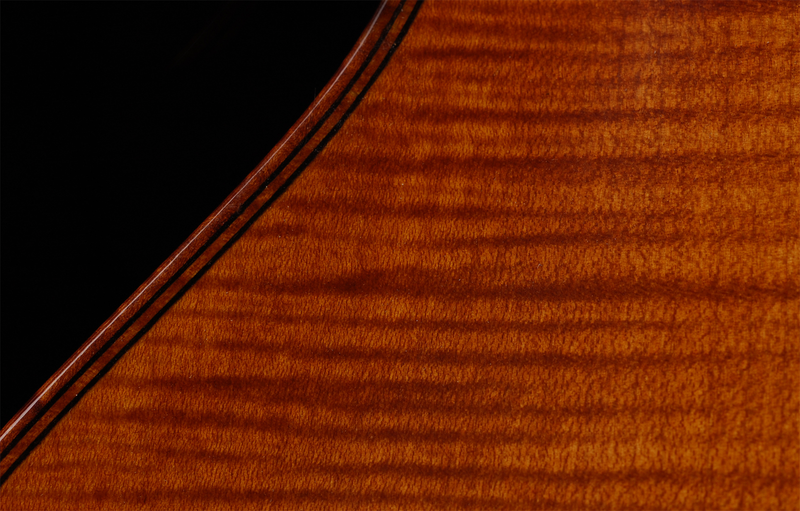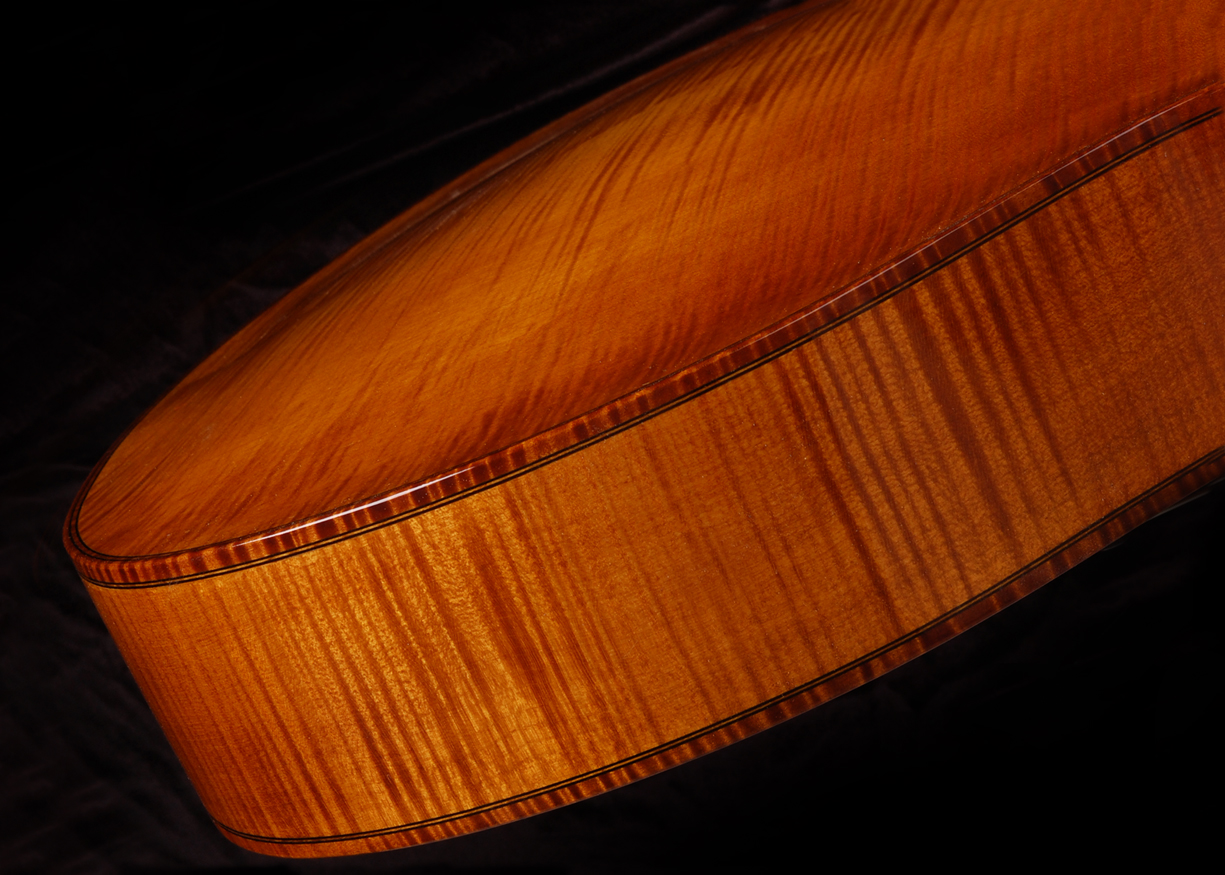 For this new Chicagoan, I chose a Romanian spruce top; a spruce that I love to use because of its sound complexity and color. I also chose a Carpathian maple back, but this set had a drastically different appearance to the set we used on the oval hole. The Oval hole back had a wide flame to it and was a little softer, this maple has a very tight flame to it. I knew that this guitar was going to be parallel braced, a bracing pattern that tends to employ a looser sound that is very much centered in the mid-range, very different than the wide-voiced oval hole. The specifications became defined and the vision of this instrument was growing.