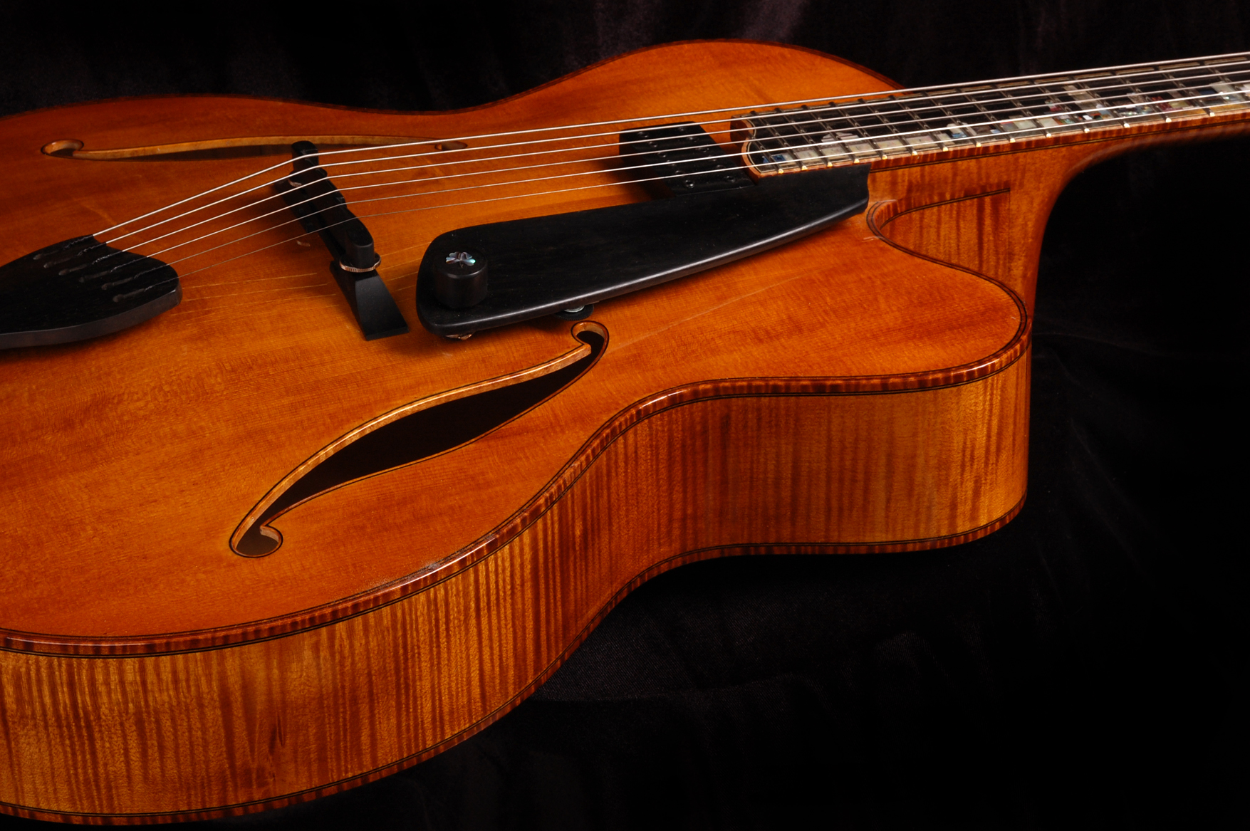 The 17″ outline reflects my old patterns and incorporates a soft cutaway. The materials are spruce, maple, and ebony. Nothing else unless you count the nickel Waverly tuners, the Kent Armstrong pickup, and the inlay. I have grown attached to making my own purfling strips on the top and back which reflect the simple and elegant purfling lines of a violin or cello. I also like making my own binding because I can control the contrast of the woods. On this guitar, I chose a maple for the binding that was naturally darker than the body maple so it creates a nice visual frame for the instrument (on a side note, that maple was such a pain in the ass to bend and I’m glad that was the last of that stuff!). The fholes are bound with this maple as well. The neck is laminated with three pieces of flame maple which features ebony accents at both the heel and the headstock. The black ebony is a great backdrop for Larry’s incredible inlay work. The bridge and tailpiece are both carved out of solid ebony and done in such a way to achieve the best strength and energy transfer while being strong enough for the strings tension throughout the instrument’s life.