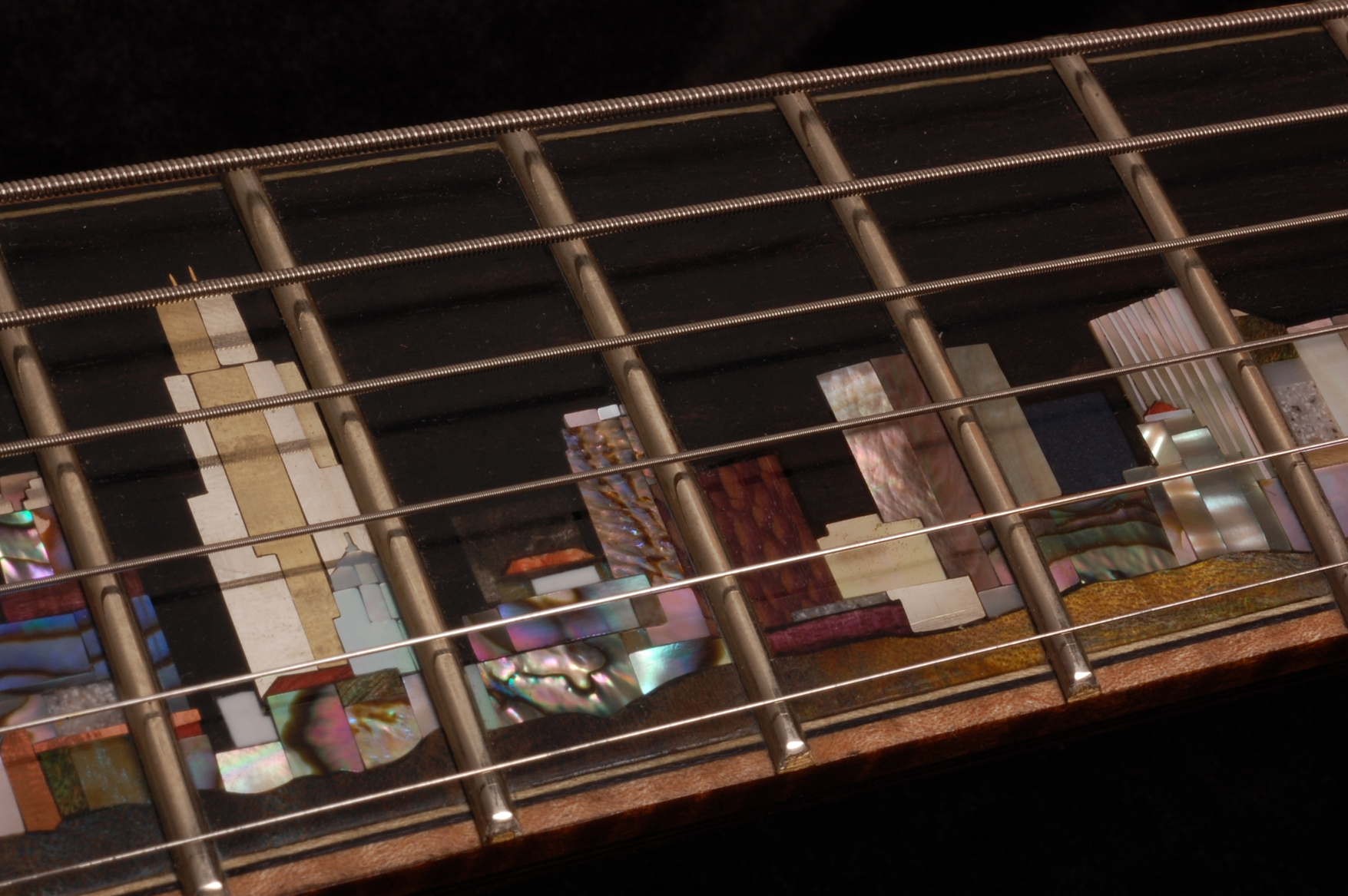 All along I knew that this was a bigger inlay project that I wanted to take on and that someone like Larry Robinson would knock it out of the park and put his own unique stamp on it. After getting the buildings laid out in perspective and in an accurate fashion, I outlined every building so that Larry could have something to work with. I spoke with Larry about it and he was also very excited for the project as he had done various city skylines but never Chicago and the design I sent him was certainly a challenge. I had high expectations just because I knew what Larry was capable of producing but I was just speechless when I received the finished inlay. I had sent Larry a rough neck with the fingerboard and when it came back the last thing I wanted to do was to put frets over it. It took a lot of extra time installing the frets than normal. Such care had to be taken not to break any of the inlay and to not scratch any of the delicate materials Larry had chosen to use.